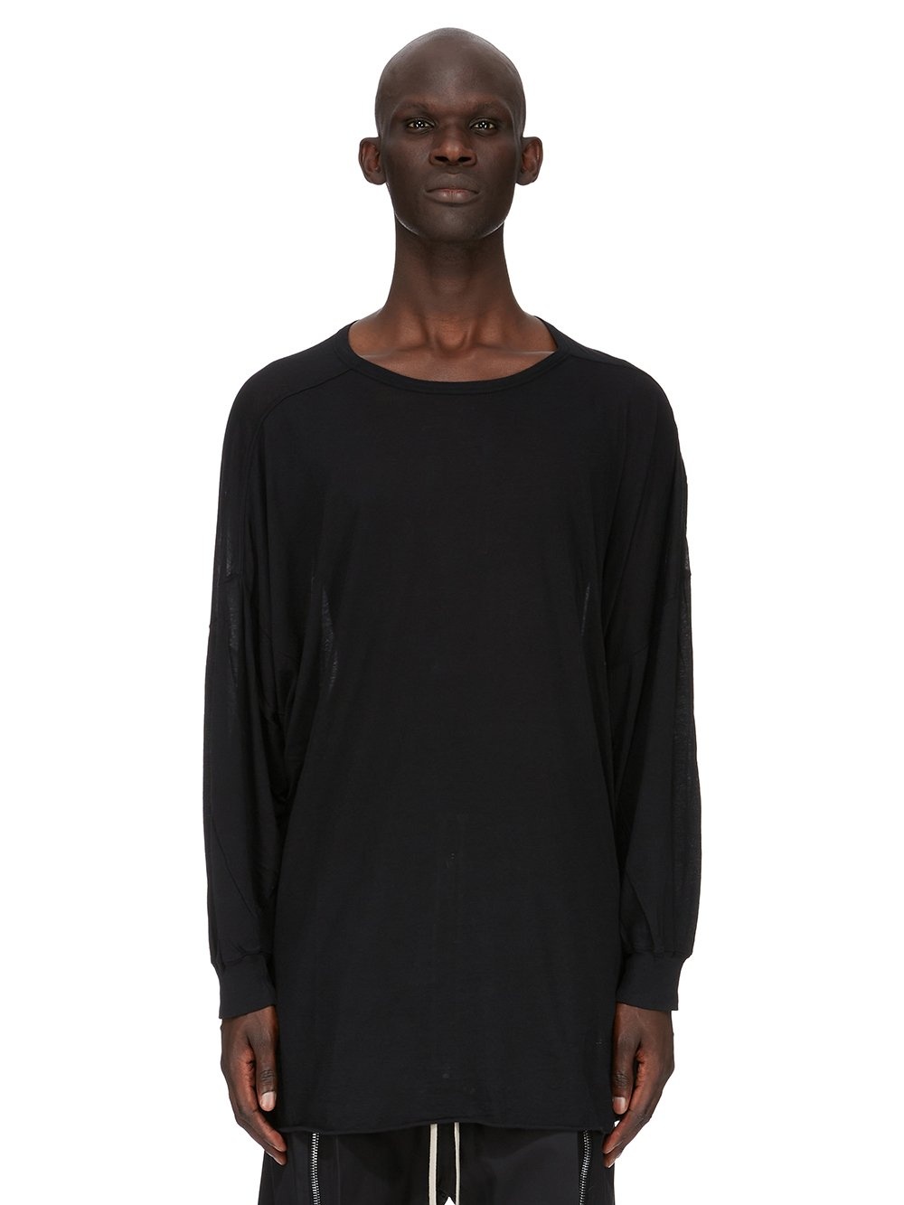 RICK OWENS FW25 CONCORDIANS TOMMY LS T IN BLACK UNSTABLE COTTON THIS TOMMY LS T IS BELOW HIP LENGTH WITH A JUMBO OVERSIZED FIT. IT HAS LONG SLEEVES WITH A DROPPED ARMHOLE, RAW CUT HEMS AND A RIBBED CREWNECK AND CUFFS. IT FEATURES SIGNATURE FRONT LEVEL SHOULDER SEAMS THIS LIGHTWEIGHT COTTON JERSEY IS SEMI-TRANSPARENT WITH A SOFT HANDFEEL THIS JERSEY IS MADE USING GOTS CERTIFIED ORGANIC COTTON WHICH MEANS THE NATURAL FIBER IS GROWN WITHOUT HARMFUL CHEMICALS, LEAVING OUR SOIL, AIR AND WATER CLEANER FROM CONTAMINATES WE STRIVE TO KEEP OUR PRODUCTION AS LOCAL AS POSSIBLE. THE FULL MANUFACTURING CYCLE OF THIS PRODUCT, FROM THE MATERIAL KNITTING TO SEWING AND FINISHING, WAS UNDERTAKEN CLOSE TO OUR HOME BASE IN CONCORDIA, ITALY COLOR: BLACK MATERIAL: 100% COTTON MODEL IS 189CM TALL ITEM IS AVAILABLE IN ONE SIZE