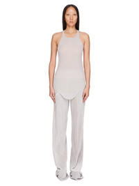 RICK OWENS FW25 CONCORDIANS BASIC RIB TANK IN PEARL MINI RIB JERSEY THIS BASIC RIB TANK IS HIP LENGTH WITH A ROUNDED RAW CUT HEM THAT DIPS IN FRONT AND BACK. IT HAS A ROUND NECKLINE AND THIN SHOULDER STRAPS THAT FLOW INTO A SLIGHT RACER BACK. IT FEATURES THE SIGNATURE SINGLE SEAM RUNNING DOWN THE CENTRE BACK SPINE THIS LIGHTWEIGHT MINI RIB JERSEY HAS A TEXTURED SURFACE AND SOFT HANDFEEL THIS JERSEY IS MADE USING GOTS CERTIFIED ORGANIC COTTON WHICH MEANS THE NATURAL FIBER IS GROWN WITHOUT HARMFUL CHEMICALS, LEAVING OUR SOIL, AIR AND WATER CLEANER FROM CONTAMINATES WE STRIVE TO KEEP OUR PRODUCTION AS LOCAL AS POSSIBLE. THE FULL MANUFACTURING CYCLE OF THIS PRODUCT, FROM THE MATERIAL KNITTING TO SEWING AND FINISHING, WAS UNDERTAKEN CLOSE TO OUR HOME BASE IN CONCORDIA, ITALY COLOR: PEARL MATERIAL: 100% COTTON MODEL IS 181CM TALL MODEL WEARS SIZE 40