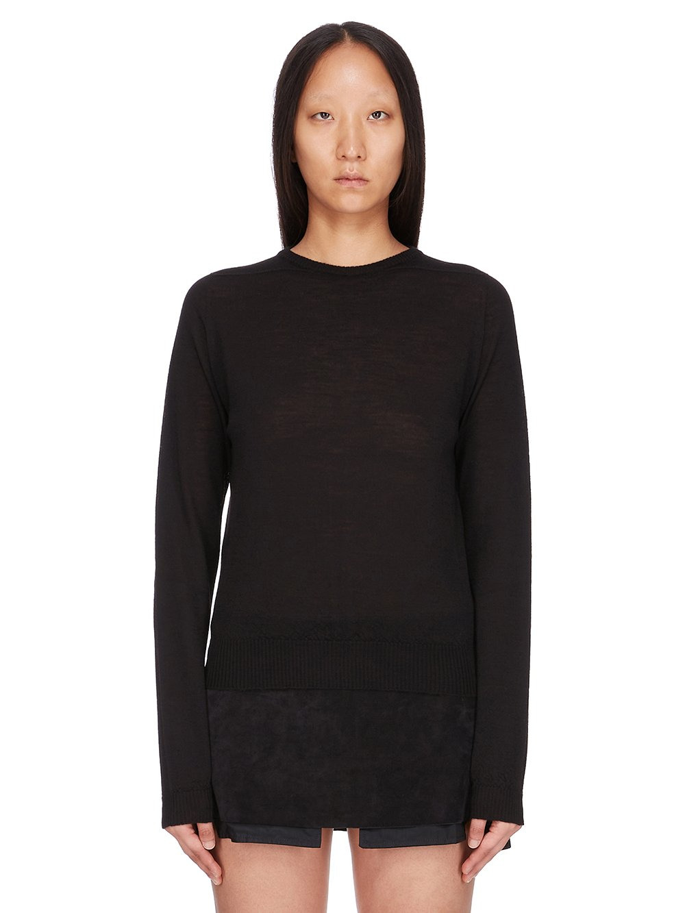 RICK OWENS FW25 CONCORDIANS BIKER LEVEL IN BLACK LIGHTWEIGHT RASATO KNIT THIS BIKER LEVEL ROUND NECK SWEATER IS HIP LENGTH WITH LONG SLEEVES. IT HAS A RIBBED ROUND NECK, CUFFS AND HEM. IT FEATURES SIGNATURE LEVEL SHOULDER SEAMS AND A KNIT LINE RUNNING DOWN THE CENTRE BACK SPINE THIS LIGHTWEIGHT AND CLASSIC STITCH WOOL KNIT HAS A SOFT HANDFEEL COLOR: BLACK MATERIAL: 100% NEW WOOL MODEL IS 181CM TALL MODEL WEARS SIZE S