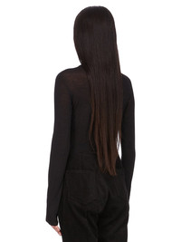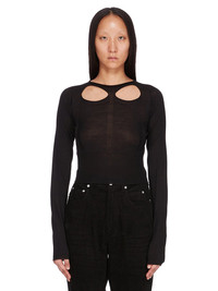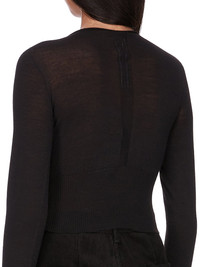 RICK OWENS FW25 CONCORDIANS SLASHED LS CROPPED IN BLACK LIGHTWEIGHT RASATO KNIT THIS SLASHED LS CROPPED IS WAIST LENGTH. IT HAS A ROLLED ROUND NECK AND FEATURES CUT OUTS ON FRONT AT TOP. IT HAS FRONT LINES MOTIVO, A WIDE, RIBBED WAISTBAND SIGNATURE CHANNEL ON THE BACK. IT IS BODY REVEALING ON FRONT. THIS LIGHTWEIGHT AND CLASSIC STITCH WOOL KNIT HAS A SOFT HANDFEEL COLOR: BLACK MATERIAL: 100% NEW WOOL MODEL IS 181CM TALL MODEL WEARS SIZE S