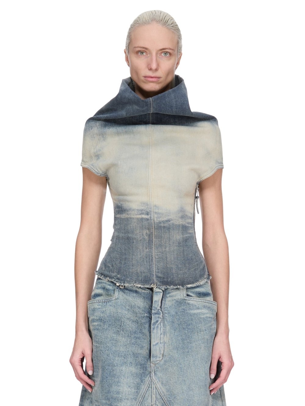 RICK OWENS FW25 CONCORDIANS SHROUD IN HUSTLER DEGRADE STRETCH DENIM THIS SHROUD IS ABOVE HIP LENGTH AND FEATURES A DRAPED TUBULAR NECK THAT WIDENS OVER THE SHOULDERS AND CREATES A SHORT FITTED SLEEVE THIS LIGHTWEIGHT HUSTLER DENIM IS MADE ON A 10OZ INDIGO AND NATURAL STRETCH DENIM. THE READY GARMENT IS STONE WASHED WITH MINERAL DYES AND THEN SPRAYED BY HAND TO ACHIEVE THE DEGRADE COLORATION THIS GARMENT IS TREATED IN AN ITALIAN WASH HOUSE BASED IN THE VENETO AREA OF ITALY, THAT PRODUCES IN SMALLER TREATMENT BATHS TO REDUCE WATER WASTE AND UTILIZE A WATER PURIFYING PROCESS THAT ENABLES THEM TO RECYCLE A PORTION OF THE WATER USED. ALL OF OUR DENIM WASHES ARE ZDHC CERTIFIED COLOR: HUSTLER DEGRADE MATERIAL: 91% COTTON + 6% ELASTOMULTIESTER + 3% RUBBER FIBER MODEL IS 181CM TALL MODEL WEARS SIZE 40