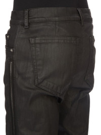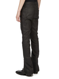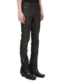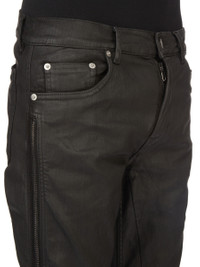 RICK OWENS SS26 TEMPLE VEGA JEANS IN BLACK DEEP BLACK STRETCH DENIM THESE VEGA JEANS ARE ANKLE LENGTH, 6 POCKET JEAN WITH ZIPPERS THAT OPEN FROM THE SHIN, GOING ALL THE WAY UP THE SIDE SEAM TO POCKET HEIGHT. THEY CAN BE UNZIPPED TO COMPLETELY REVEAL THE LEG. THIS LIGHTWEIGHT DEEP BLACK DENIM IS MADE ON A 10OZ BLACK AND NATURAL STRETCH DENIM. THE READY GARMENT IS OVERDYED BLACK AND THEN A DEEP BLACK WAX IS APPLIED IN A THICK LAYER BY HAND. THIS GARMENT IS TREATED IN AN ITALIAN WASH HOUSE BASED IN THE VENETO AREA OF ITALY, THAT PRODUCES IN SMALLER TREATMENT BATHS TO REDUCE WATER WASTE AND UTILIZE A WATER PURIFYING PROCESS THAT ENABLES THEM TO RECYCLE A PORTION OF THE WATER USED. ALL OF OUR DENIM WASHES ARE ZDHC CERTIFIED. THIS ITEM IS PART OF THE RICK OWENS COLLABORATION WITH NEW YORK PUNK DUO SUICIDEBANDOFFICIAL AND FEATURES A SIGNATURE LABEL ON THE INTERIOR. THE BAND PIONEERED THE USE OF MINIMALIST ELECTRONIC INSTRUMENTATION DURING THE 1970S. THE RAW, DISTURBING SOUND AND THREATENING, CHAOTIC LIVE SHOWS OF VOCALIST ALAN VEGA AND MUSICIAN MARTIN REV WERE MET WITH HOSTILITY EARLY ON — THEY WERE CONSIDERED OUTSIDERS AMONG THEIR CONTEMPORARIES AND LARGELY VILIFIED, BUT THEIR INFLUENCE HAS BEEN SIGNIFICANT IN THE DECADES SINCE. I USED THEIR SONG CHEREE FOR ONE OF MY FIRST RUNWAY SHOWS AND NOW I HAVE DEVELOPED A CAPSULE COLLECTION WITH THE SUPPORT OF THE BAND, REFERENCING THEIR DESTROYED, DECONSTRUCTED LEATHERS, TAILORED JKTS, AND ATHLETIC TRACK TOPS. COLOR: BLACK MATERIAL: 91% COTTON 6% POLYESTER 3% ELASTANE MODEL IS 189CM TALL MODEL WEARS SIZE 29