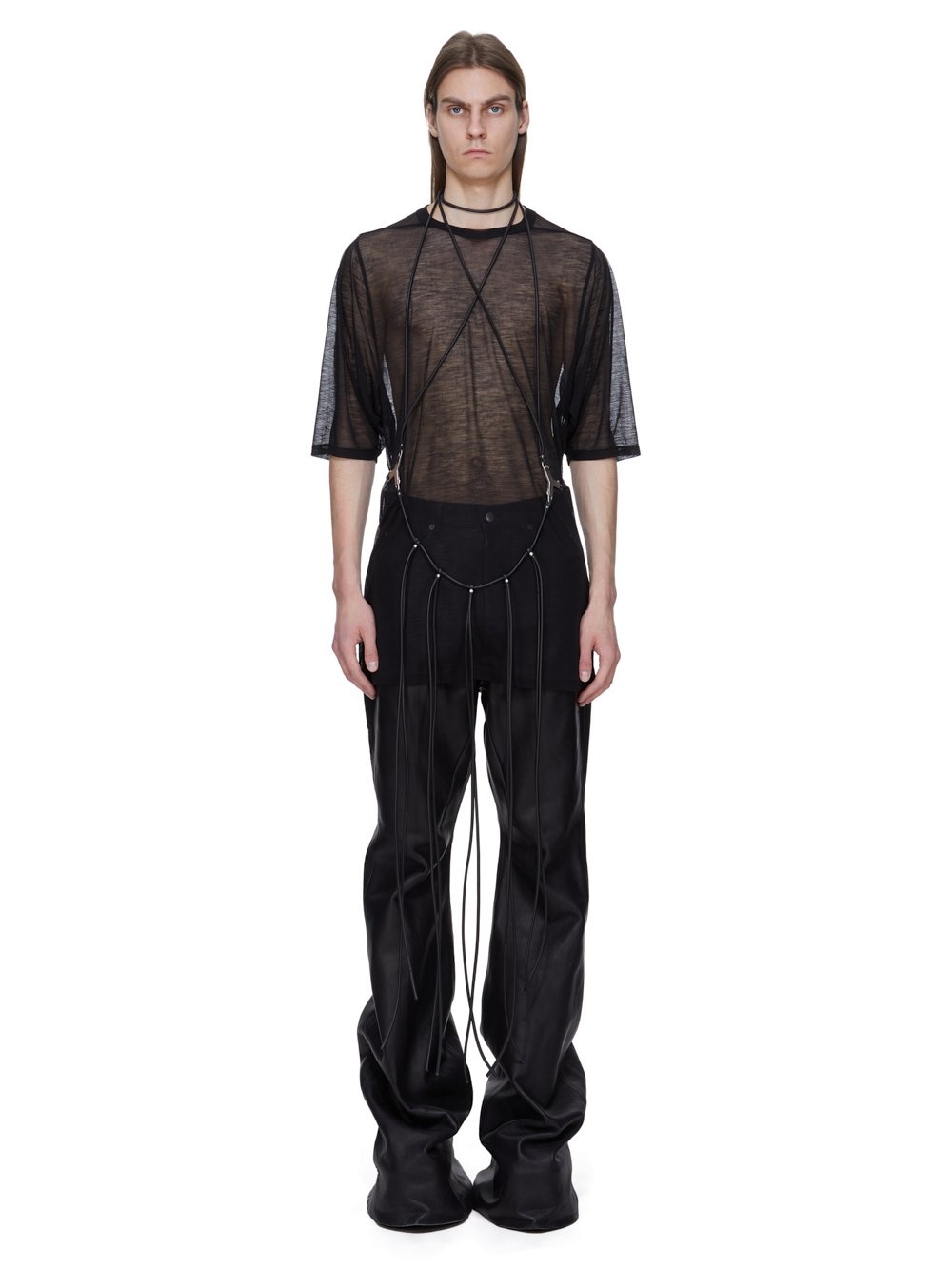 RICK OWENS FW25 CONCORDIANS RUNWAY CORD TANK FRINGED IN BLACK BUTTER CALF LEATHER THIS CORD TANK IS MADE FROM SEVERAL CORDS GOING AROUND THE NECK AND CROSSING OVER THE CHEST AND AROUND THE WAIST. THEY ARE LINKED TOGETHER BY TWO SMALL CERBERUS KEYCHAINS THAT FEATURE A TRIPLE-SIDED SNAP HOOK, ENGRAVED WITH THE RICK OWENS LOGO. THIS VERSION FEATURES LEATHER FRINGES, ATTACHED WITH RIVETS, FALLING FROM THE FRONT WAIST TO BELOW KNEE THIS LIGHTWEIGHT FULL GRAIN CALF LEATHER IS FINISHED ONLY USING ANALINE AND NATURAL OILS IN ORDER TO ACHIEVE ITS BUTTERY AND SEMI SHINY SURFACE COLOR: BLACK MATERIAL:100% CALF LEATHER MODEL IS 189CM TALL MODEL WEARS SIZE S