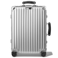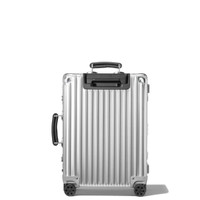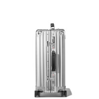 Designed for the most discerning travelers, the RIMOWA Classic Cabin in silver effortlessly combines luxury with functionality. Rooted in heritage, each RIMOWA Classic hard shell suitcase features a high-end anodized aluminum alloy, riveted high-gloss aluminum corners, and hand-made leather handles, creating the perfect balance between craftsmanship and superior engineering. Designed to fit in most airplane overhead bins, this lightweight aluminum suitcase is ideal for short weekend or business trips of 2-3 days. Designed and engineered in Germany. Includes a complimentary leather luggage tag and sticker set. Key elements TSA-Approved Locks Each of our suitcases features TSA-approved locks that can be opened by security during airline baggage checks without causing any damage. Flex Divider Packed items are kept in perfect order during transit with the height adjustable Flex Divider, which can be adapted to suit your belongings. Multiwheel® System Pioneered by RIMOWA, this high-end system guarantees stable and effortless steering thanks to ball-bearing mounted wheels with cushioned axels. Telescopic Handle Engineered to offer a stageless handle for custom height adjustment and an ergonomic grip with a leather insert on the underside for optimum comfort. Size and Weight Measurement 21,7 x 15,8 x 9,1 INCH Weight 9,5 Lbs Volume 9,5 Gal Materials Outside : Aluminium Inside : Polyester Handles : Leather Wheels: Hard plastic Dividers: Polyester