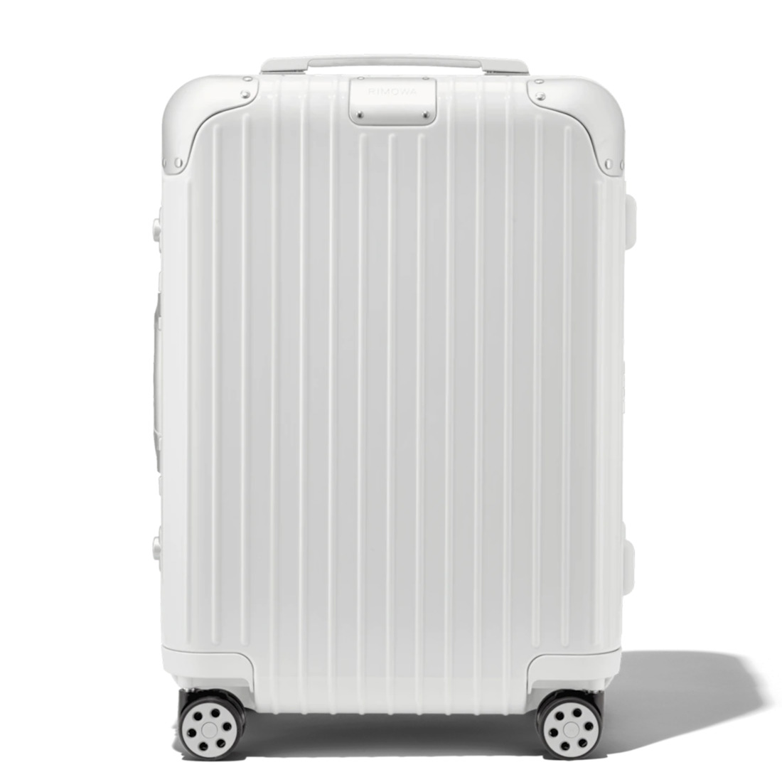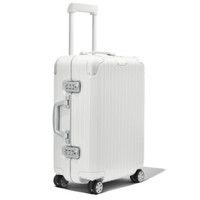 A thoughtful combination of two of the world’s most advanced materials, the RIMOWA Hybrid Cabin in white unites the resilience of our unique aluminium-magnesium alloy with the supremely lightweight quality of polycarbonate, creating a high-end piece of German engineering designed for a lifetime of purposeful travel. Designed and engineered in Germany to fit in most airplane overhead bins, this lightweight cabin case is ideal for a short weekend or business trip. Includes a complimentary leather luggage tag and a sticker. Video: The models are 189cm-6'2" tall (man) and 175cm-5'7" tall (woman). Key elements TSA-Approved Locks Each of our suitcases features TSA-approved locks that can be opened by security during airline baggage checks without causing any damage. Flex Divider Packed items are kept in perfect order during transit with the height adjustable Flex Divider, which can be adapted to suit your belongings. Multiwheel® System Pioneered by RIMOWA, this high-end system guarantees stable and effortless steering thanks to ball-bearing mounted wheels with cushioned axles. Telescopic Handle Engineered to offer seamless stage-free adjustment for maximum comfort and smooth manoeuvrability. Size and Weight Measurement 21,7 x 15,8 x 9,1 inch Weight 8,4 Lbs Volume 9,8 Gal Materials Outside: Polycarbonate Inside: Polyjacquard Zippers: KK Metal Handles: Plastic Wheels: Polycarbonate Dividers: Polyjacquard