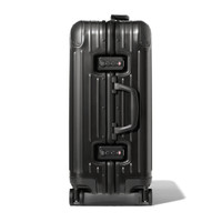The unmistakable RIMOWA Original aluminum suitcase with its distinctive grooves is regarded as one of the most iconic luggage designs of all time. Made from high-end anodized aluminum, the RIMOWA Original Cabin Plus in black is engineered with longevity in mind. Remarkably robust and surprisingly lightweight, the timeless classic is an unparalleled example of craftsmanship and innovation. This extra spacious carry-on luggage provides just a little extra room for up to 4 days of travel. Designed and engineered in Germany. Includes a complimentary leather luggage tag and sticker set. Key elements TSA-Approved Locks Each of our suitcases features TSA-approved locks that can be opened by security during airline baggage checks without causing any damage. Flex Divider Packed items are kept in perfect order during transit with the height adjustable Flex Divider, which can be adapted to suit your belongings. Multiwheel® System Pioneered by RIMOWA, this high-end system guarantees stable and effortless steering thanks to ball-bearing mounted wheels with cushioned axels. Telescopic Handle Engineered to offer seamless stage-free adjustment for maximum comfort and smooth maneuverability. Size and Weight Measurement 22,1 x 17,8 x 9,9 INCH Weight 10,4 Lbs Volume 11,9 Gal Materials Outside: Aluminum Inside: Cotton Zippers: KK Metal Handles: Plastic Wheels: Polycarbonate Dividers: Cotton