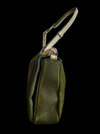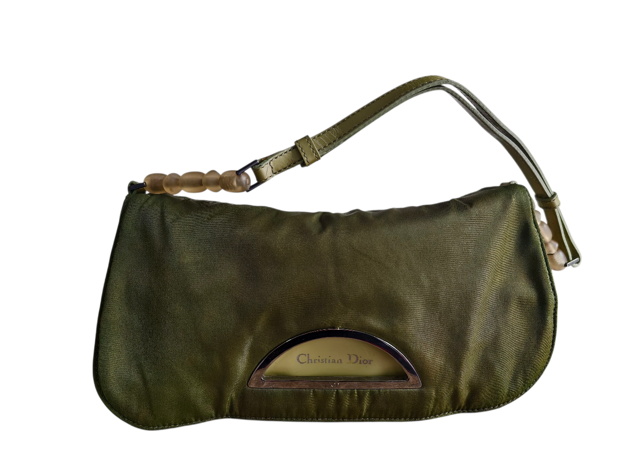 Authentic Christian Dior shoulder bag from the early 2000s (2003). Olive green nylon with signature half-moon metal logo plate. Comes with original Dior authenticity card. Condition: well-used vintage piece with visible creases, stains and interior repair (please refer to photos). A rare Galliano-era archive bag, perfect for collectors or restoration. 🏷️ Category Brand: Christian Dior Type: Shoulder bag Color: Green / Khaki Material: Nylon Condition: Good (with visible signs of wear)