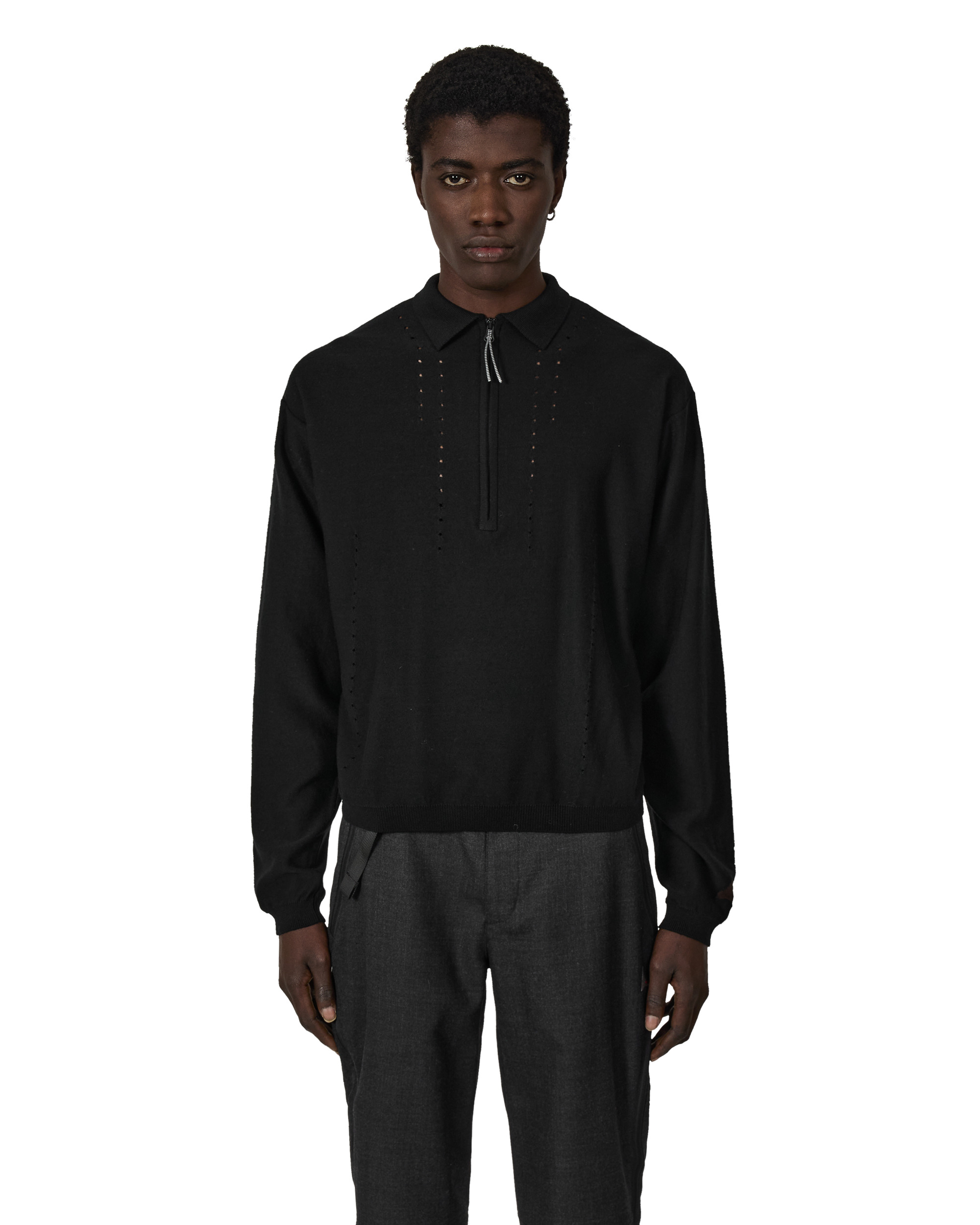 The Pinched Wool Knit Polo in black color is made from a soft and breathable merino wool blend yarn, offering natural temperature regulation and comfort. Designed with a half-zip front for versatile styling, it features drop-stitch holes on the body for subtle texture and breathability. A unique pinched stitch detail on the back adds a refined touch, while the regular fit ensures easy wear. Details - Soft and breathable merino wool blend yarn Size and Fit Male model is wearing size M and he is 6,1 ft/1.86m with chest 34.2in/85cm Composition Self: 100% Virgin Wool Made In Italy