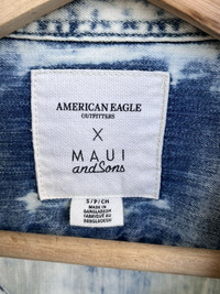 Rare American Eagle x Maui & Sons collab shirt in bleach-washed denim. Clean front with dual chest pockets, but the real standout is the bold embroidered shark logo on the back - pure vintage surf/ skate energy. Easy layering piece with a worn-in, West Coast vibe. Y2K meets modern chill. Condition: • Good used condition • No holes or major flaws • Subtle fade & natural wear Shipping & Return: • Ships via FedEx International (5-8 business days) • Buyer responsible for import/ customs fees (if any) • No returns - check photos & sizing before purchase ありがとうございました (Thank You) ~ rOAdRunNeR cOlleCtioN ~