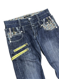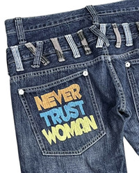 🔥ARCHIVE ENERGY. RAW MESSAGE. ZERO FILTER🔥 🔥"NEVER TRUST WOMAN"🔥back pocket statement hit - loud, confrontational, pure 2000s underground attitude. This isn't safe fashion. This is statement denim. Heavy grunge influence with double waist illusion, bondage-style industrial zipper detailing. The neon yellow front zips cut through the dark indigo wash like warning tape. Details: • Straight cut silhouette • Fits waist 32" • Double waist construction • Dual neon zipper pockets (front thigh) • Polkadot + check contrast lining • Faded whisker wash • Back graphic text printed 💥The mix of punk hardware + playful polkadot/ check panels creates chaotic balance — rebellious but calculaten💥 Condition: Good vintage condition Sizing (Refer to measurements provided) This is not mass-market denim. This is underground Japanese-style street archive energy. Perfect for: Balenci-core / Punk revival / LGB vibes / Hysteric-era styling / Layered grunge fits It you understand statement denim — you already know. Serious buyers only. Shipping & Returns: • Ships worldwide via FedEx/DHL Express (ETA 5-8 business days from Asia) • Buyer responsible for customs/ import fees (if any) • No returns - review all photos & description carefully ありがとうございまし (Thank you) ~ rOAdRunNeR cOlleCtioN ~