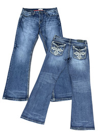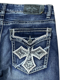 Antique Rivet denim with heavy Chrome Hearts-style embroidered cross detailing on the back pockets. Flap back pocket design, 5-pocket layout, and a light flare cut give strong Y2K punk vibes. Mid-wash stretch denim with whiskering and fading for that worn-in look. Solid construction with bold stitching throughout. Size W34, fits true. Rare vintage-inspired pair for fans of rock, grunge, or statement jeans. ➤ BRAND NAME : ANTIQUE RIVET (JAPANESE BRAND) CONDITION : (USED : 8/10) MATERIAL : Stretch Denim ......…................................................................ ➤ SIZE MANUAL MEASUREMENT / LAID FLAT (INCHES) WAIST : 17“(W34") LENGTH ; *Outseam : 43" *Inseam : 32" .......….............................................................. ➤✈️WORLDWIDE EXPRESS SHIPPING ✈️ DHL / FedEx (ETA) 5~8 Days Worldwide (From Asia) ありがとうございました(Thank You) ~ rOAdRunNeR cOlleCtioN ~