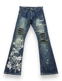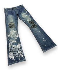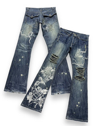 🔥FYE🔥GUMU INTERNATIONAL Punk Ripped Tribal Print Flare Denim ➤ BRAND NAME : GUMU INTERNATIONAL CONDITION : (USED : 8/10) MATERIAL : Denim ......…................................................................ ➤ SIZE MANUAL MEASUREMENT / LAID FLAT (INCHES) WAIST : 15.5“(W31") LENGTH ; *Outseam : 42" *Inseam : 33.5" .......….............................................................. ➤✈️WORLDWIDE EXPRESS SHIPPING ✈️ DHL / FedEx (ETA) 5~8 Days Worldwide (From Asia) ありがとうございました(Thank You) ~ rOAdRunNeR cOlleCtioN ~