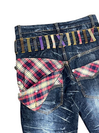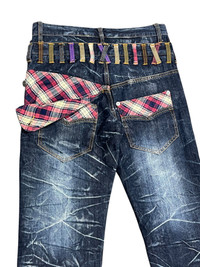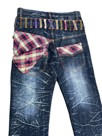 EXPLOSION by Nylaus Acid Wash Double Waist Jeans • Inspired by Vivienne Westwood punk aesthetic & Undercover's experimental tailoring • Classic red tartan plaid accents - Iconic punk staple • Half-side back open flap detail for edgy, deconstructed look • Mixed media: denim + fabric overlays • Distressed & splatter acid wash finish for raw, rebellious vibe Fit: Slim / straight Style: Punk / Grunge / Avant-Street Very rare, statement collectible denim from Japan's underground scene. ➤✈️EXPRESS SHIPPING ✈️ The Items Will Be Shipped From Asia (Malaysia) Using DHL EXPRESS / ETA (5~8 Days) Worldwide ありがとうございました(Thank You) ~ rOAdRunNeR cOlleCtioN ~
