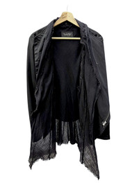 Rare designer piece from Tornado Mart — a masterclass in Japanese grunge tailoring. Asymmetrical front closure, sharp silhouette with flowing distressed hem lining detail. The inner gauze-style layer is removable, adding versatility for layering. Lightweight yet structured, perfect for avant-garde, darkwear, or visual kei fits. Condition: Light wear, no major flaws. Liner edges intentionally raw. Styling tip: Pair with flared pants or stacked trousers & heavy boots for full goth-ninja energy. Shipping & Returns: • Ships worldwide via FedEx Express (ETA 5-8 business days from Asia) • Buyer responsible for customs/ import fees (if any) • No returns - review all photos & description carefully ありがとうございました (Thank You) ~ rOAdRunNeR cOlleCtioN ~
