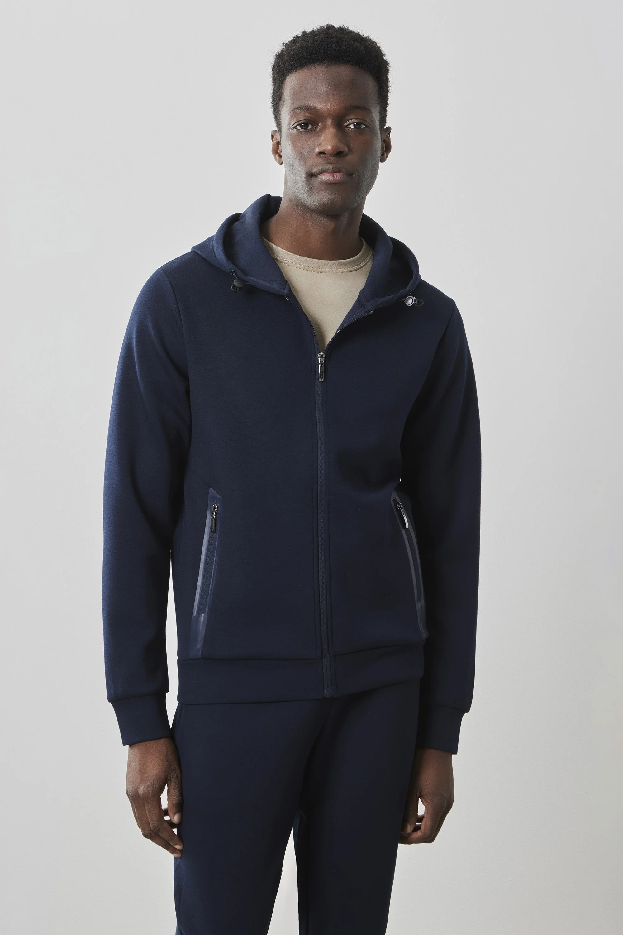 The Brixton Navy Full Zip Hoodie from Robert Barakett is made from a premium technical knit for everyday comfort. It features zipped pockets, a hood, and a double zip closure with metal trims, along with vinyl trim on the pockets for a city cool aesthetic. Features - Made from a premium technical knit for everyday comfort - Featuring zipped pockets, a hood, with a double zip closure using metal trims - Vinyl trim on pockets for a city cool aesthetic