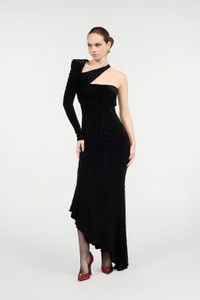 ID: VWT125-CJ003-05051 The animal kingdom is once again a source of inspiration for Roberto Cavalli, expressed in this elegant velvet dress through a Jaguar Skin pattern with a devore effect. The garment features a refined one-shoulder design with a geometric cut-out neckline and is completed by an asymmetrical skirt which is fitted to the knee and fluid at the hem. Details - Long velvet devore-effect dress - All-over Jaguar Skin pattern - One-shoulder design - Geometric neckline with cut-out - Long sleeves - Asymmetrical skirt with looser fit at the hem