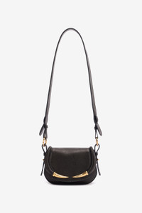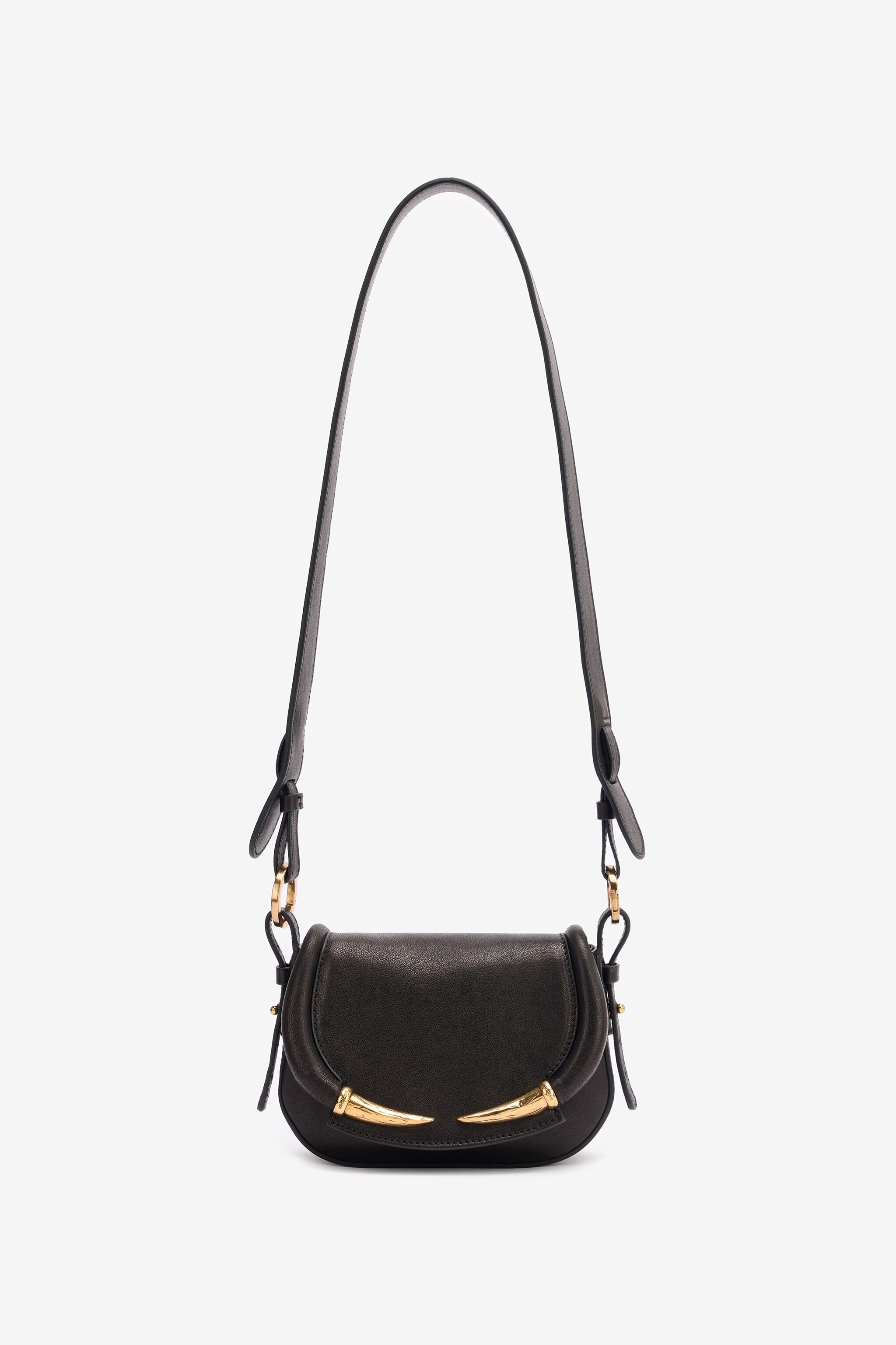ID: SWB007-PNI00-05051 Made of soft leather with a hammered effect, this bag with a rounded shape does not sacrifice Roberto Cavalli's distinctive codes, here expressed by the double tiger Fang detail that stands out on the flap. The model is complemented by an adjustable and removable matching shoulder strap enhanced by the Mirror Snake Monogram in a gold metallic version and is embellished with the interior lined with Jaguar Skin print, a tribute to the brand's passion for animal textures. Details - Hammered-effect leather bag - Can be carried over the shoulder or by hand - Double Fang detail with engraved Roberto Cavalli logo - Flap with magnetic button - Adjustable matching shoulder strap that can be removed with the clasps - Gold-tone metal Mirror Snake Monogram on the shoulder strap - Cotton-blend lining with Jaguar Skin print - Roberto Cavalli label on the interior - Made in Italy Care & maintenance Leather - Fur:Ovis Aries Aries / Lining:97% Cotton, 3% Elastane