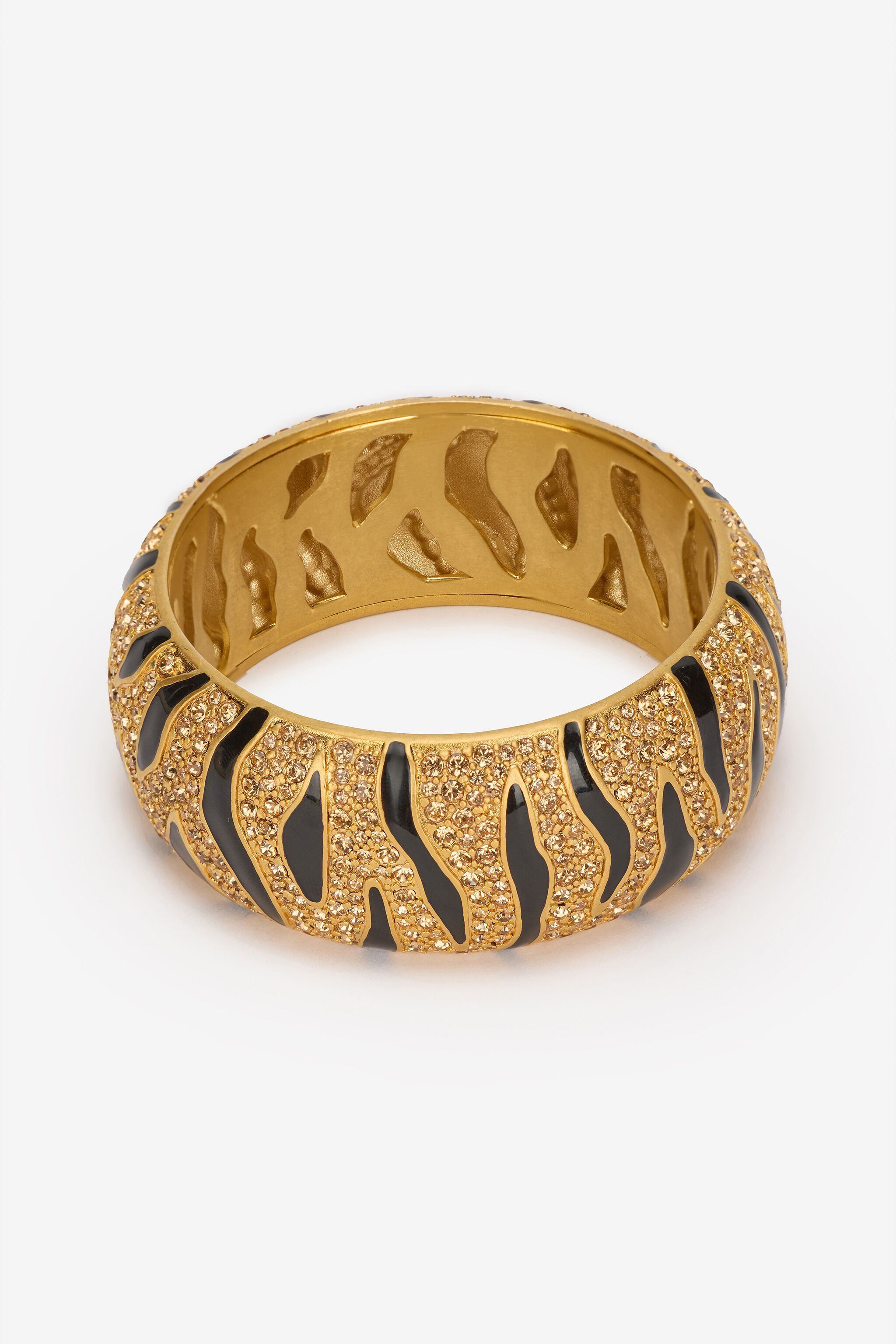 ID: VKG004-AM011-D3879 A cascade of sparkling set crystals, interrupted only by the streaks of the Tiger Skin pattern, brings life to the entire surface of this exquisite bangle with a gold-colored finish, perfect for adding a timeless touch of luxury to special occasion looks. Details - Bangle with gold-colored finish - All-over crystals with contrasting Tiger Skin pattern