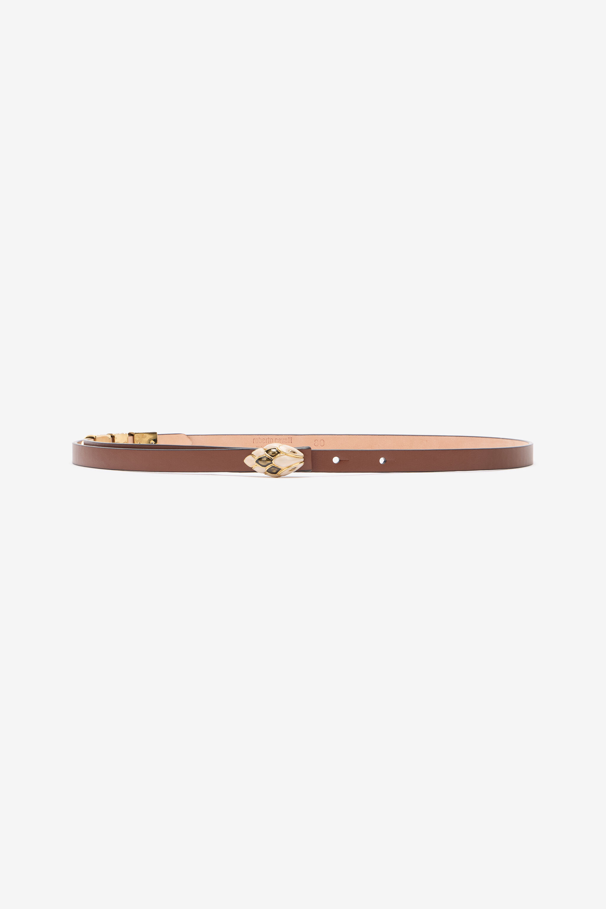 ID: VKC004-PZ796-03501 This slim belt by Roberto Cavalli with a timeless hammered effect is defined by a buckle in the shape of a snake's head with an enameled finish on which scales and eyes stand out in a contrasting shade. The accessory, crafted in Italy, is further enhanced by three crystal-studded belt loops, each adorned at the center with a colorful stone. Details - Hammered-effect slim belt - Buckle with enameled snake head - Three bejeweled belt loops with central stone - Contrasting interior with Roberto Cavalli logo - Made in Italy