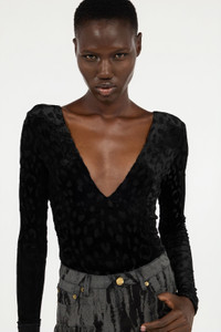 ID: VWT609-CJ003-05051 The iconic tone-on-tone Jaguar Skin motif with a devore effect is the absolute star of this long-sleeved bodysuit by Roberto Cavalli, perfect for adding a touch of wild sophistication to the wardrobe. Details - Long-sleeved bodysuit - All-over Jaguar Skin pattern - Plunging V-neck on the front - Deep round neckline on the back - Roberto Cavalli label on the inside collar - Made in Italy