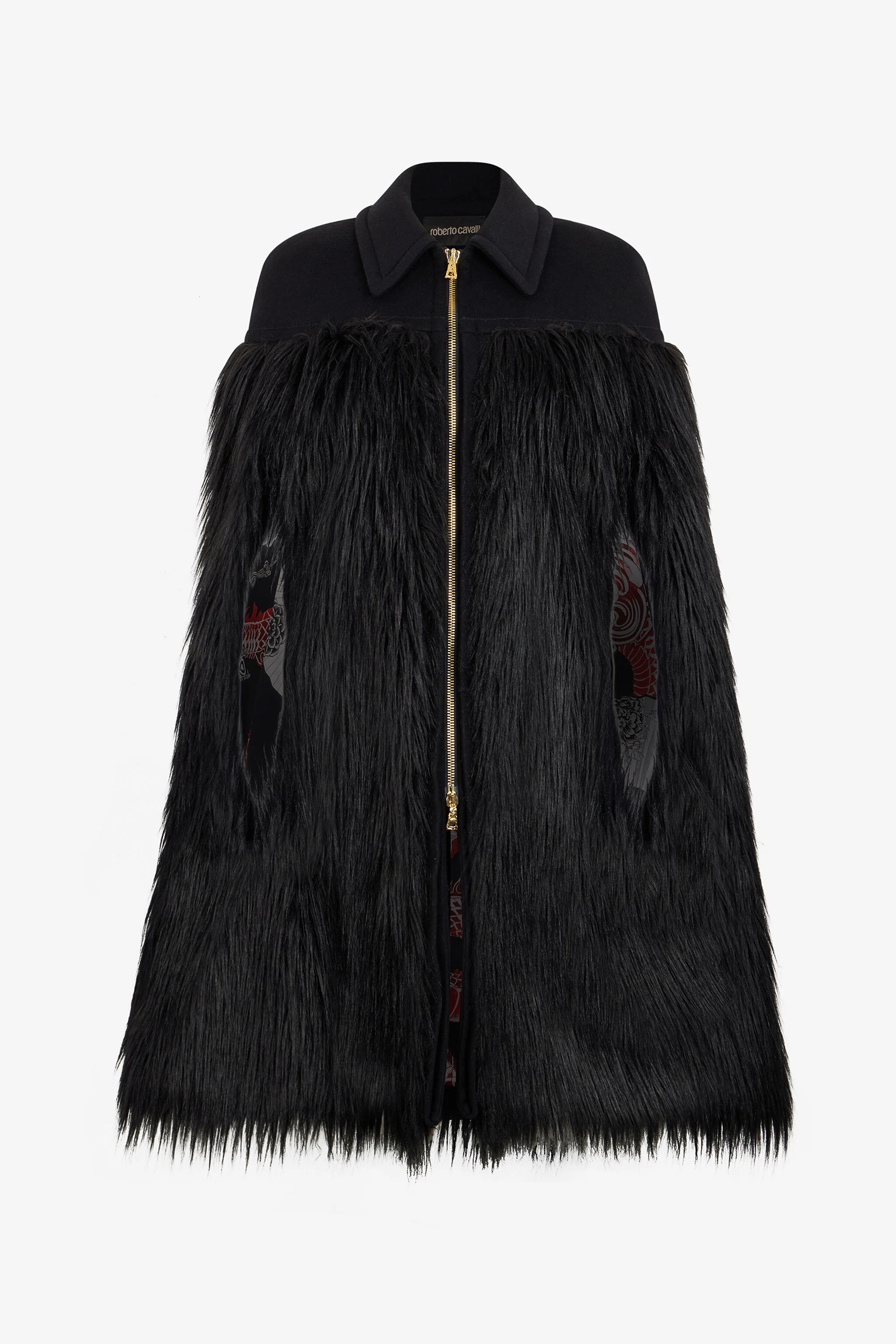 ID: VQT501-FT027-05051 Add a touch of luxury to your winter wardrobe with this cape by Roberto Cavalli, crafted from soft and warm faux fur. The piece features a pointed collar and a front zipper with a double pull, while the interior reveals an exquisite contrasting Chinese dragon print. Details - Cape in faux fur - Pointed collar - Smooth collar and shoulders - Lining with contrasting Chinese dragon print - Front closure with double slider zipper