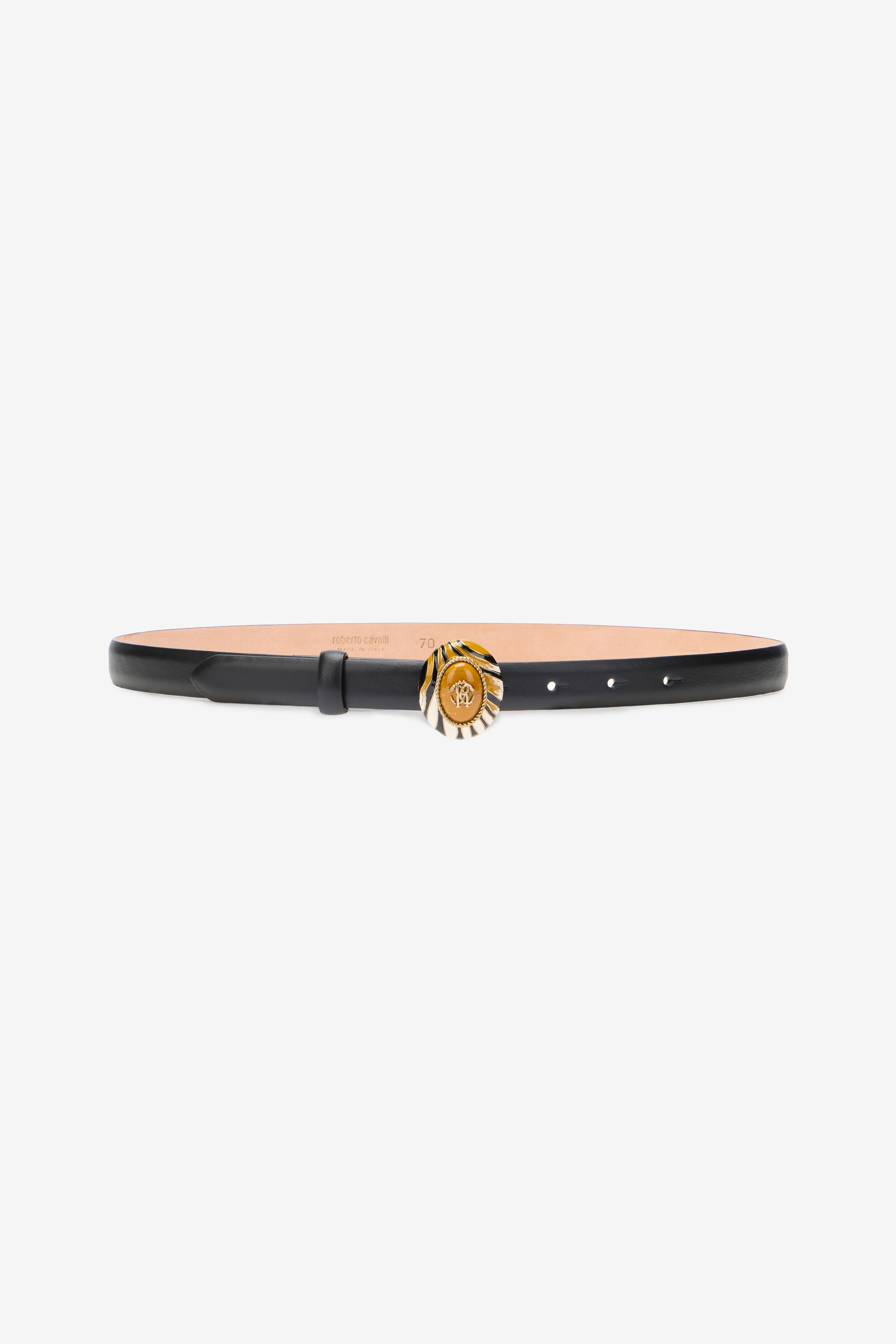 ID: VKC001-PZ796-T0047 A masterpiece of Italian craftsmanship that elevates any look. This Roberto Cavalli belt combines the timeless elegance of fine black leather with the bold statement of its distinctive buckle. The round buckle, a true jewel, features an iconic animalier motif and is embellished with the golden Monogram RC, a symbol of unmistakable style and luxury. An accessory designed not just to cinch the waist, but to define your personality with a touch of audacious glamour. Details - Black leather belt with a streamlined design. - Crafted from fine Bos Taurus leather for a luxurious feel and exceptional durability. - Round jewel buckle with an animalier pattern and gold-tone metal Monogram RC. - Features an adjustable pin-buckle fastening. - Perfect for embellishing dresses, skirts, or for cinching the waist on outerwear. - Pair with an all-black look to make the buckle pop, or with coordinating prints for a bold statement. - Made in Italy. Care & maintenance Leather - Fur:Bos Taurus / Lining:100% Bos Taurus