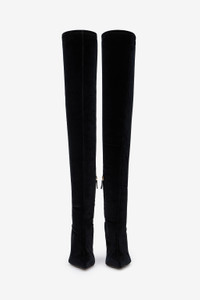 ID: VWS004-VZ018-05051 These over-the-knee boots by Roberto Cavalli combine elegance and sensuality. The model, with a high spool heel and pointed-toe design, is embellished with the emblematic metallic RC Monogram under the sole and is finished with a concealed zipper fastening at the side. Details - Satin thigh high boots with a pointed-toe design - Slim fit - Above-knee height - Metallic RC monogram under the sole - Roberto Cavalli lettering engraved on the outsole - Concealed zipper at the side with metal pull-tab - Made in Italy