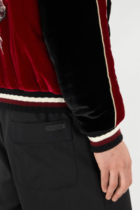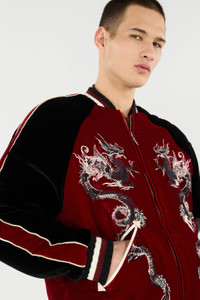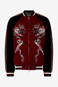 ID: VNT464-VL053-02002 Make an authentic style statement with this intense-toned bomber jacket featuring two sinuous dragons embroidered on the front, echoed on the back accompanied by the Asian-style Roberto Cavalli logo. The chromatic contrasts of the model are accentuated by the raglan sleeves with side band and the striped pattern on the neck, cuffs and hem, while providing a further functional touch are the two side pockets and the double-slider front zip with a pull-tab in the shape of the iconic tiger Fang. Details - Bomber jacket with double-slider zipper - Tiger Fang-shaped pull-tab - Long contrasting raglan sleeves - Contrasting bands on the sleeves - Embroidered dragons on the front and back - Two ideograms at the hem - Asian-style Roberto Cavalli logo on the back - Rib-knit collar, cuffs, and hem with a contrasting striped pattern - Two side pockets - Metal chain hanger loop - Roberto Cavalli label on the inside collar