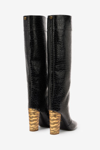 ID: VKS013-PZ579-05051 The universe of the animal world, which has always been a source of inspiration for Roberto Cavalli, is the undisputed protagonist of these bold knee-high boots featuring an upper with crocodile scale-effect embossing and a contrasting golden heel with an animalier-inspired motif. Details - Knee-high boots - Crocodile scale-effect upper - Thick golden heel with animal-inspired motif - Metal Mirror Snake Monogram at the back of the leg - Metallic RC monogram under the sole - Made in Italy