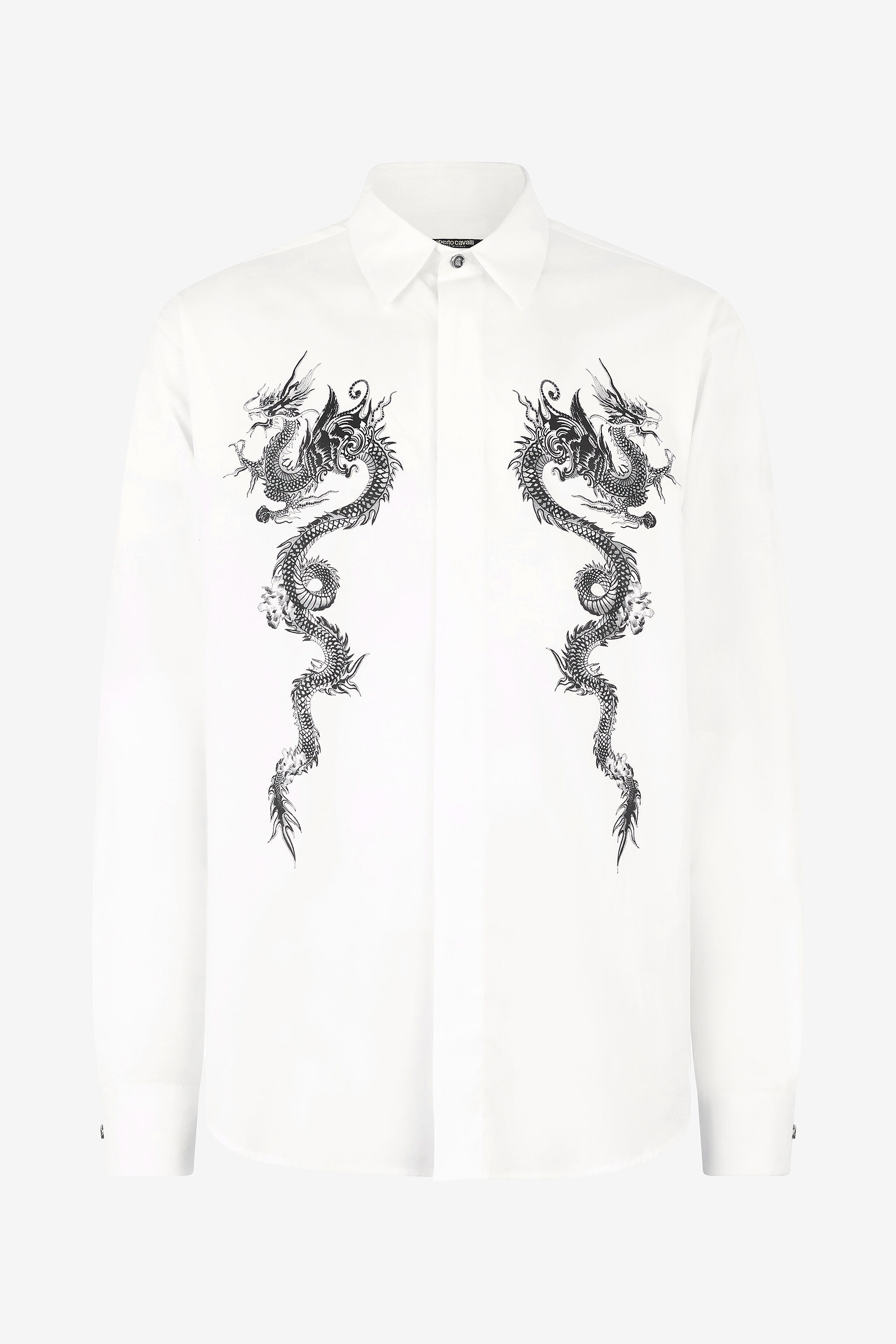 ID: VNT712-CH026-00052 Two maxi contrasting dragons back-to-back: this is how Roberto Cavalli reinterprets the classic cotton shirt in an oriental-inspired version. The design is completed by the branded snake buttons on the hidden front fastening and on the cuffs, for a tribute to the Maison's distinctive style and the charm of the reptile universe. Details - Pure cotton shirt - Two maxi contrasting dragons printed on the front - Pointed collar - Long sleeves - Branded button with snake on the hidden front fastening and on the cuffs - Roberto Cavalli label on the inside collar - Made in Italy