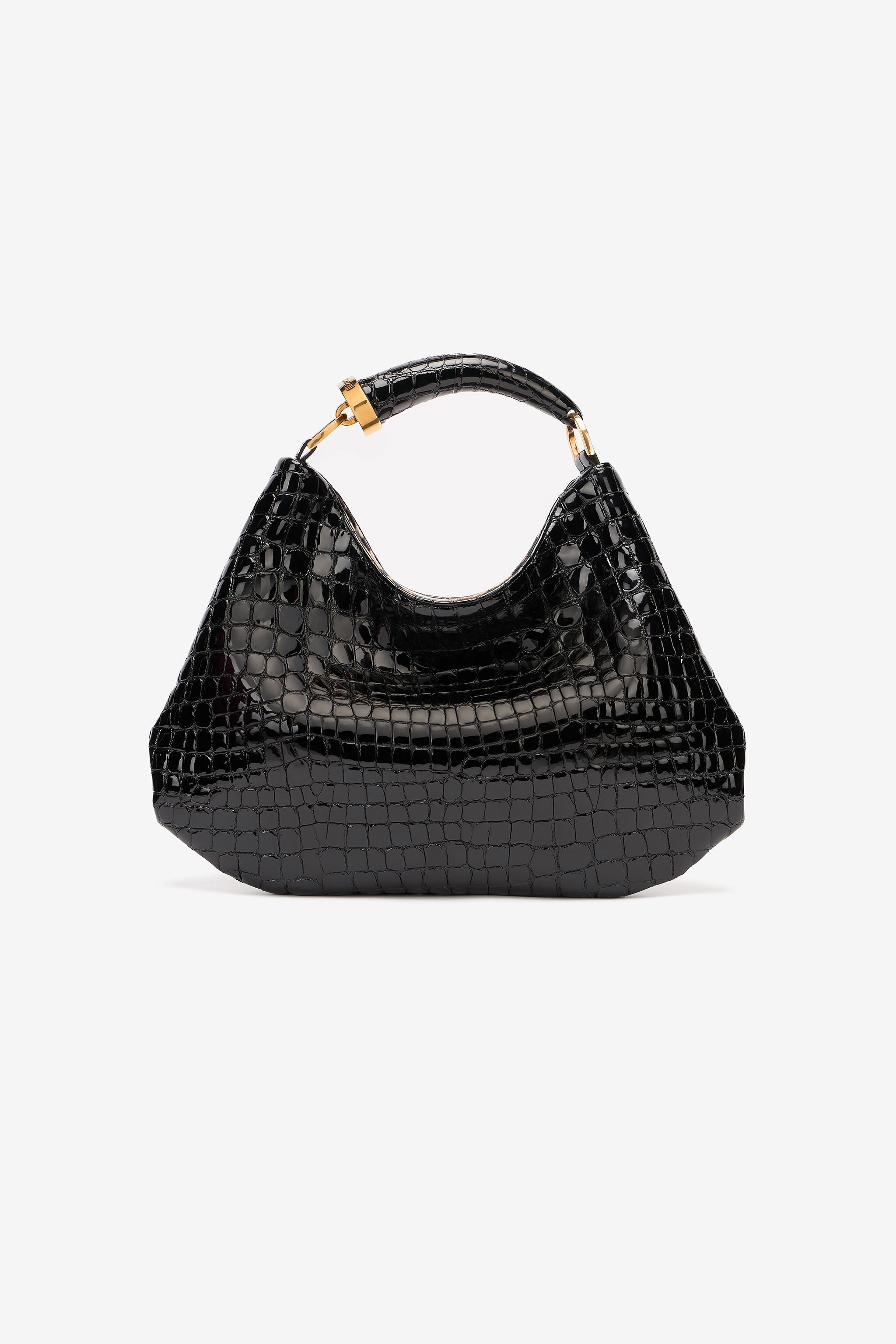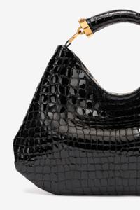 ID: TKB009-PZE04-D0007 Crafted from leather with the elegant crocodile scale-effect embossing, this large hobo bag is enhanced by a lining with the signature Jaguar Skin print and one of the most recognizable details of the Roberto Cavalli aesthetic: the tiger Fang, here in the form of a matching handle. Details - Glossy crocodile scale-effect leather hobo bag - Large size - Fang-shaped handle - Cotton-blend lining with Jaguar Skin print Care & maintenance Leather - Fur:Aegagrus Hircus / Lining:97% Cotton, 3% Elastane
