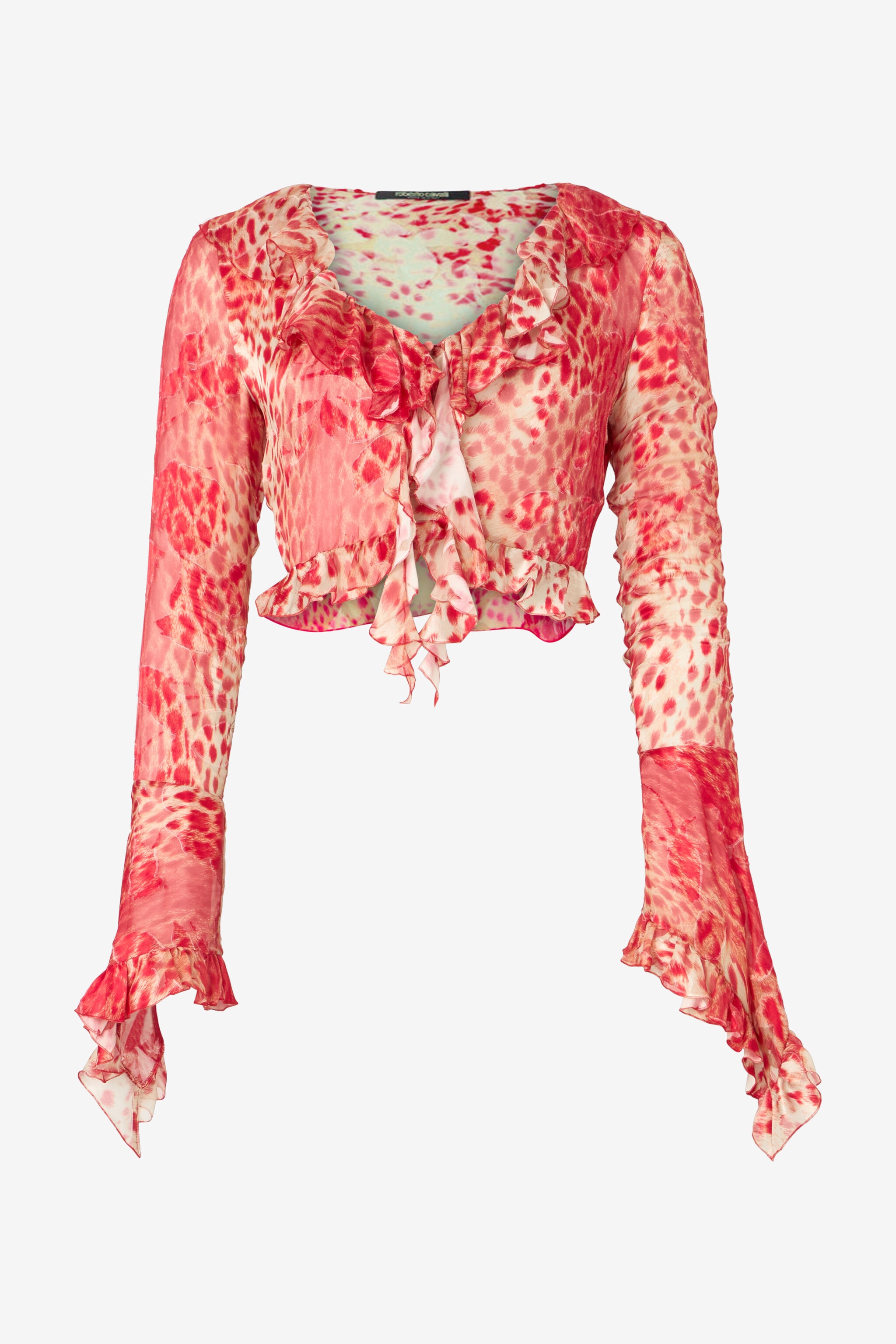 ID: UKT707-HEN58-02534 In this long-sleeved crop top by Roberto Cavalli, details with a romantic feel such as the frilled trims blend perfectly with the wild elegance of the animalier, here expressed by the Jaguar Skin print that extends over the entire surface of the garment. Further embellishing the model is a refined transparent floral motif. Details - Crop top with Jaguar Skin print and sheer floral design - Long sleeves - Slightly V-shaped loose neck - Flounced finishes on the outer trims - Roberto Cavalli label on the inside collar Care & maintenance External fabric:75% Viscose / Rayon, 25% Silk