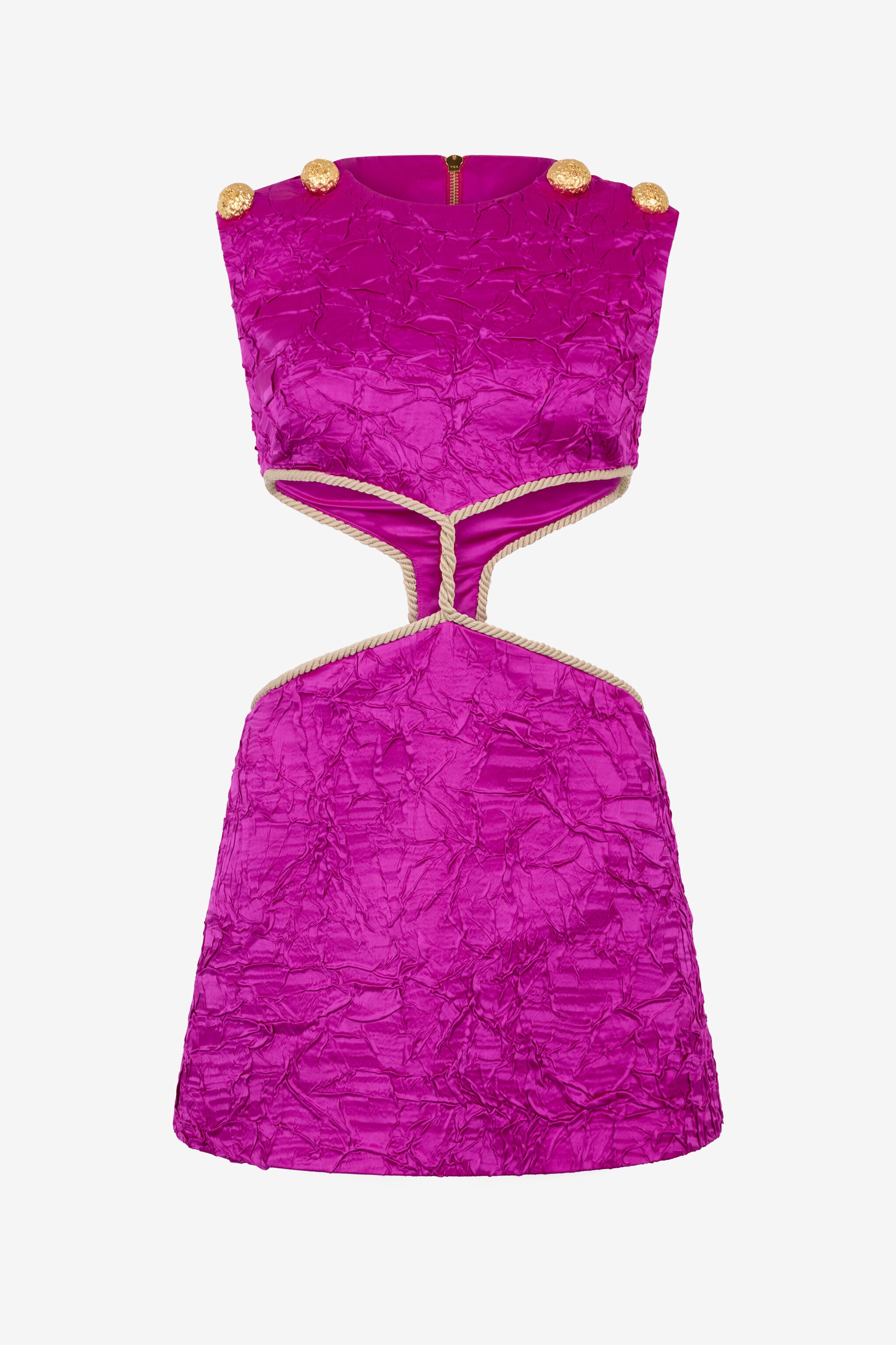 ID: UWT101-SE045-02520 This fuchsia mini dress embodies bold elegance, perfect for those who want to dare with style. The side cut-outs, accented by a delicate contrasting cord, reveal the silhouette with a touch of sensuality. The golden buttons on the shoulders add an element of discreet luxury, making it ideal for unforgettable evenings. The model is 178 cm tall and wears size S / 40. Details - Figure-hugging design that enhances the silhouette - Cut-out details with rope trims - Invisible zip fastening at the back - Made in: Italy - Ideal for evening events, exclusive parties or special occasions - Add minimal accessories for a sophisticated look Care & maintenance External fabric:100% Silk