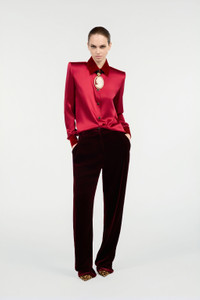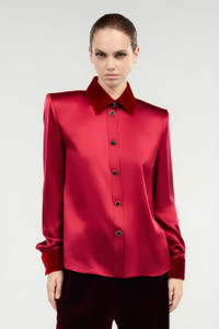 ID: VWT700-SE041-02065 An expression of an elegant style that is never predictable, this pure silk shirt with a minimalist design features a collar, back panel and cuffs in soft tone-on-tone velvet. The model is finished with engraved buttons and gold-tone trims. Details - Pure silk shirt - Velvet collar, back insert and cuffs - Long sleeves - Cuffs with button - Yoke with box pleat on the back - Front fastening with buttons Care & maintenance External fabric:100% Silk / Secondary fabric:82% Viscose / Rayon, 18% Silk