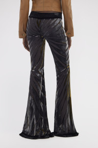 ID: RWT207-VLI15-01080 The Ray of Gold trousers capture the essence of nocturnal glamour with their graphic pattern that radiates elegance. Crafted from luxurious devore velvet, they feature a flared silhouette that elongates the figure, creating fluid and captivating movement with every step. A bold and sophisticated piece, destined to make a statement. The model is 178 cm tall and wears size S / 40 IT. Details - High-waisted design with a flared leg - Crafted from a precious viscose and silk blend with a devore effect - Contrasting velvet waistband and hem trim - Concealed side zip closure - Ideal for exclusive evenings or glamorous events - Pair with a minimalist top and high heels to enhance the silhouette - Made in Italy Care & maintenance External fabric:75% Viscose / Rayon, 25% Silk / Secondary fabric:80% Viscose / Rayon, 20% Silk / Lining:100% Polyester