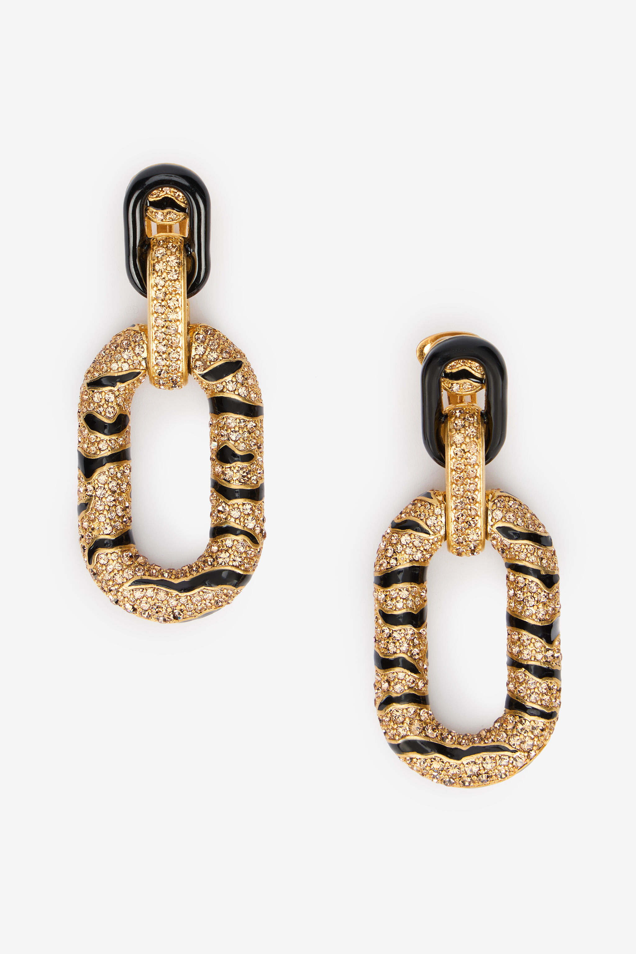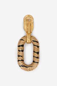 ID: VKG011-AM011-D3879 A cascade of sparkling crystals set against enamel stripes in the Tiger Skin pattern adorns the entire surface of these bold oval-shaped earrings with a gold-tone finish, perfect for adding a touch of wild luxury to special occasion looks. The back of this jewelry, entirely crafted in Italy, is finished with an oval plaque engraved with the Roberto Cavalli logo, an additional nod to the Maison’s DNA. Details - Drop earrings with Tiger Skin pattern - Set crystals - Enameled finish - Roberto Cavalli logo engraved tag on the back - Clip-on - Made in Italy