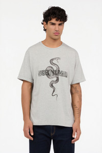 ID: ROT60D-JD055-05020 This short-sleeve crew neck T-shirt, crafted from a cotton blend, embodies the distinctive codes of the Roberto Cavalli universe. The design stands out with a large front print featuring the Maison's iconic logo overlaid with a majestic snake in an attacking pose, symbolizing the power of the reptile world. Details - T-shirt in cotton blend - Front print with Roberto Cavalli logo and snake - Crew neck - Short sleeves - Roberto Cavalli label inside the collar Care & maintenance External fabric:65% Cotton, 35% Polyester