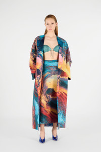 ID: UWT504-DJ091-D2394 This coat with Itaca Print is a wearable work of art. Its enveloping silhouette and waist belt define the figure, enhancing femininity with a touch of originality. Perfect for those who want to stand out with class and style. The model is 178 cm tall and wears size S. Details - Coat with matching belt - Exclusive design with Itaca Print - Comfortable fit - Made in: Italy - Ideal for a sophisticated and artistic look, perfect for special events or to add a touch of elegance to everyday life. Care & maintenance External fabric:53% Cotton, 47% Polyester / Secondary fabric:100% Silk