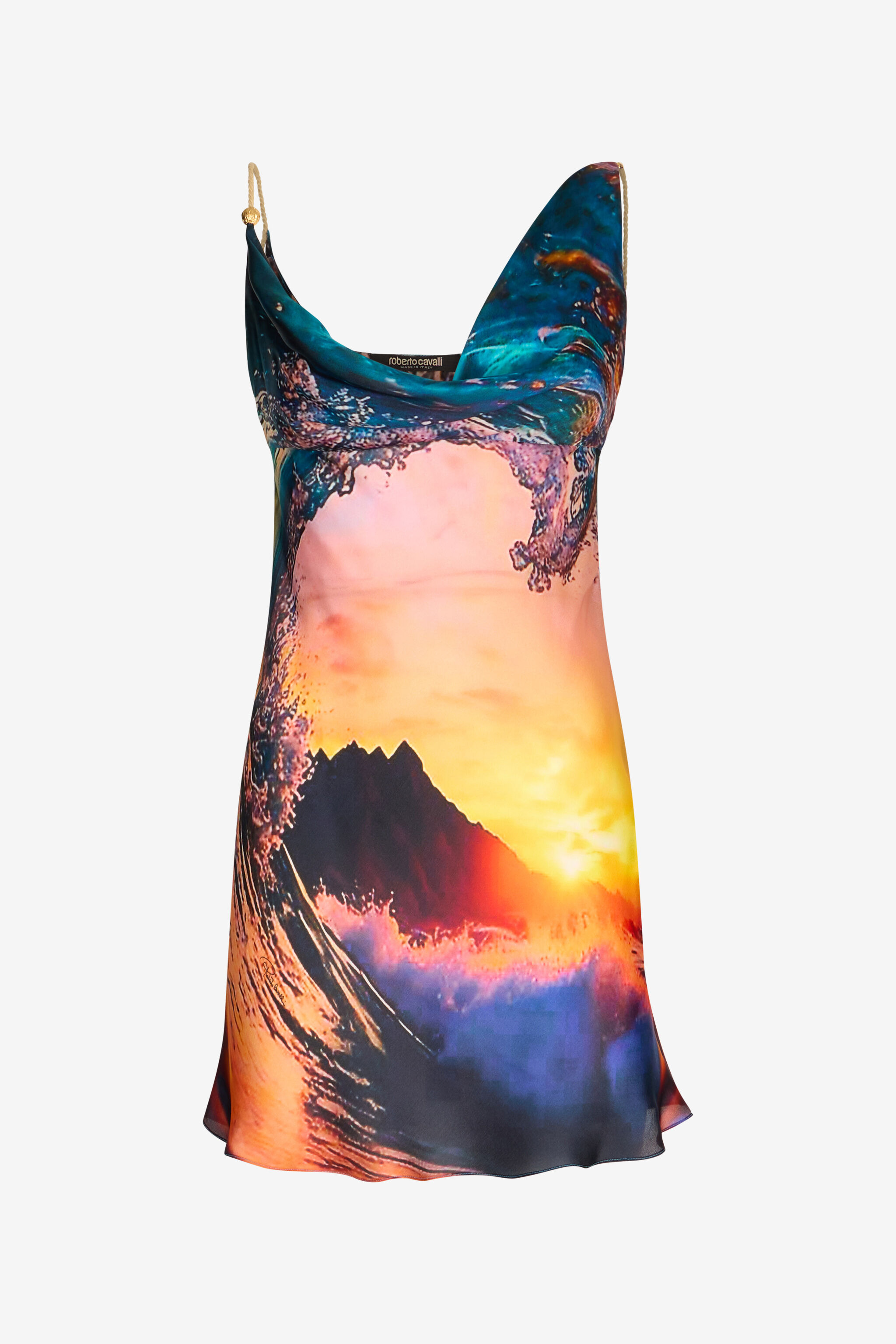ID: UWT135-CTN98-D2394 Capture the breathtaking beauty of a Mediterranean sunset with the Itaca dress. Crafted from pure, fluid silk, its surface is adorned with a dramatic print depicting a powerful wave crashing against a sun-drenched landscape. The silhouette is defined by a soft cowl neckline that drapes elegantly, while delicate braided straps add a touch of artisanal refinement. This dress is an ode to epic beauty and untamed femininity, designed to turn heads at any exclusive event. The model is 178 cm tall and wears size S / 40 IT. Details - Cowl neck slip dress - Crafted from lustrous pure silk for a fluid drape - All-over Itaca print - Braided spaghetti straps with gold-tone hardware - Mini length - Perfect for summer cocktails and exclusive evening events - Complete the look with minimalist sandals and a clutch - Made in Italy Care & maintenance External fabric:100% Silk