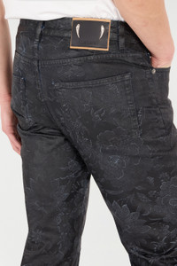 ID: VNJ201-VT035-05051 An emblem of casual and contemporary luxury, these pure cotton jeans from Roberto Cavalli flaunt the brand’s must-have details. The model stands out for its practical and timeless five-pocket design and for its original floral motif with bleached-effect edging, an expression of a bold style that makes no compromises. The garment is further embellished by references to the brand's universe, such as the metal button with snake and the unmistakable branded tag with Fang details on the back. Details - Pure cotton denim jeans - All-over floral pattern with a bleached effect - Straight leg - Five-pocket design - Zipper and branded button with snake fastening - Branded tag with Fang details on the back