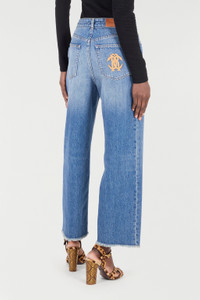 ID: UKJ206-VT008-04564 Jeans, a garment that transcends any trend, have been overhauled by Roberto Cavalli in this wide-leg style made from pure cotton denim with distressed-effect fading. This five-pocket garment features a slightly frayed hem, yet has not done away with the brand’s custom details, represented by the iconic Mirror Snake Monogram embroidered on the back pocket, the tag with lettering on the back and the branded button on the front. Details - Pure cotton denim jeans - Straight, wide leg - Cotton lining - Five-pocket design - Belt loops - Distressed effect - Mirror Snake Monogram embroidered on the back pocket - Tag with lettering on back - Zipper and branded button fastening - Slightly frayed hems Care & maintenance External fabric:100% Cotton / Lining:100% Cotton