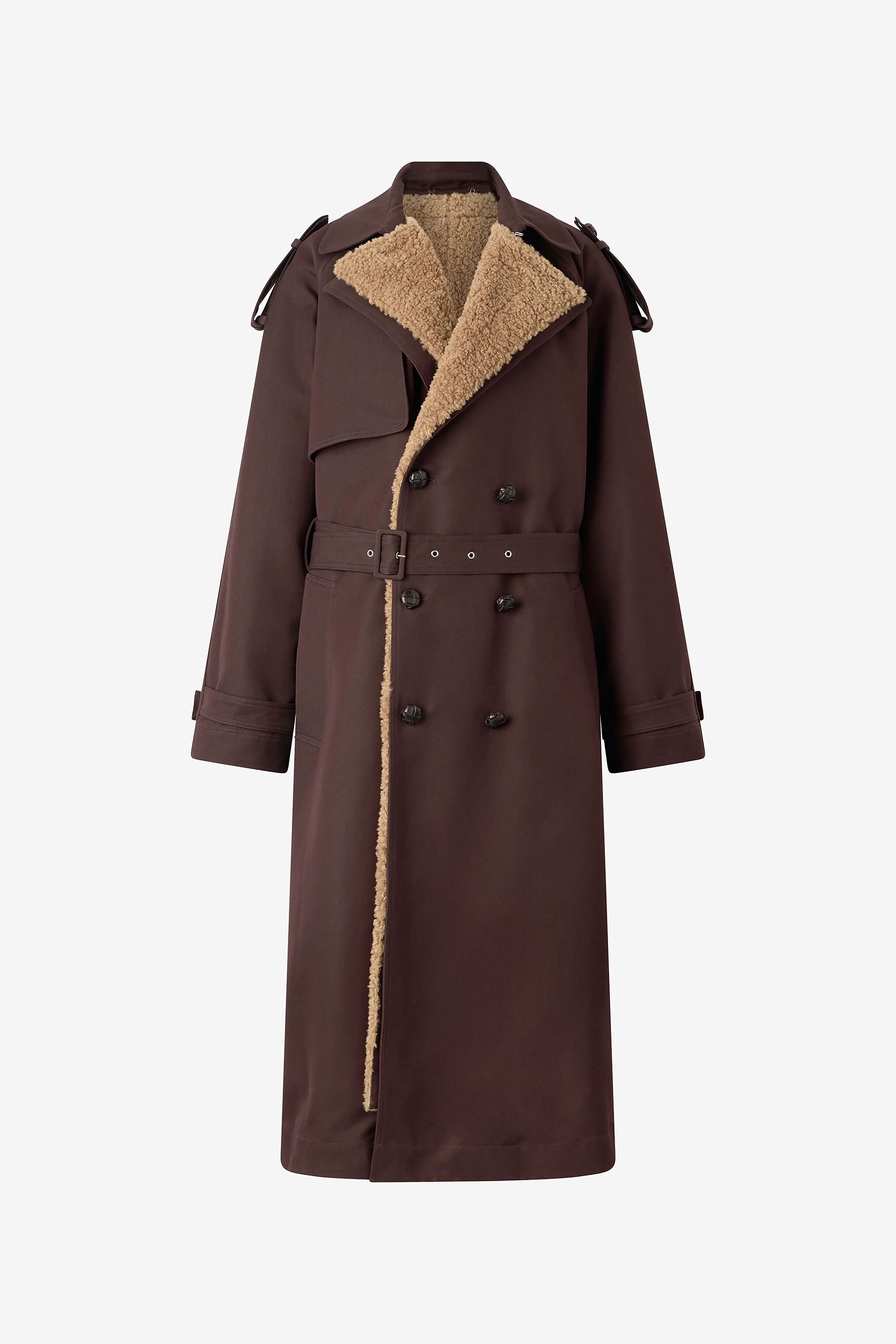 ID: VRT531-FN071-01660 Roberto Cavalli revisits a classic in the men's wardrobe: the long trench coat. This pure cotton garment features a classic design consisting of details such as the shoulder adjusters, windproof flap, detached yoke at the back, waist belt and wrist straps, and features a contrasting soft faux shearling interior. Details - Pure cotton long trench coat - Faux shearling interior - Pointed collar - Classic lapel top opening - Long sleeves - Straps with buckles at the wrists - Adjustment straps on the shoulders with braided buttons - Windproof flap - Two side pockets - Belt with buckle at the waist - Detached yoke at the back - Back vent - Double-breasted fastening with braided buttons
