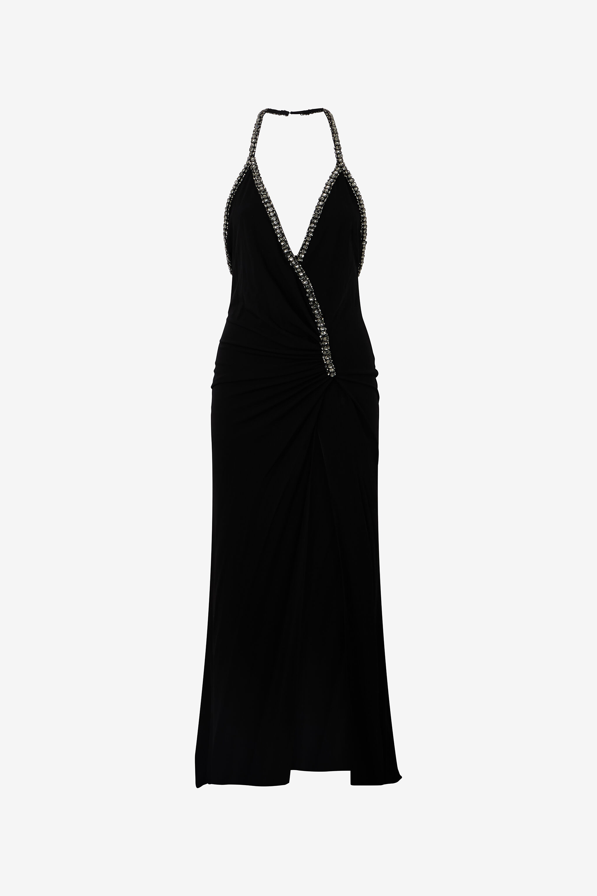 ID: VQR103-JE034-05051 Synonymous with glamorous and sensual femininity, this elegant long dress by Roberto Cavalli stands out due to its shimmering jewel trims studded with rhinestones that embellish the decolletage and halterneck. The garment also features a refined open-back design and a deep side slit, giving an intriguing touch of sensuality to your exclusive event looks. Details - Long dress with rhinestone trims - Halterneck - Tight fit that loosens at the hem - Open-back design - Deep side slit - Floor length