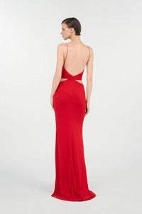 ID: WKT115-JE034-02057 A seductive floor-length dress in a vibrant red that instantly draws the eye. The deep V-neckline converges at a central jeweled detail, creating a draped effect that enhances the silhouette. A piece that enchants with its elegance and sophisticated allure. Details - High-quality material - Deep, daring neckline - Central jewel detail - Figure-hugging, sophisticated silhouette - Flawless craftsmanship