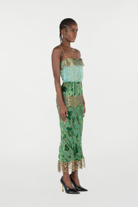 ID: VKT119-FC007-D0112 This long silk dress by Roberto Cavalli stands out for its soft tones enlivened by a contrasting floral velvet pattern and for the interplay of shapes and textures created by sophisticated floral lace inserts with a see-through effect at the decolletage, hips, and hem. The ruched design highlights the waist, while the shiny motif featuring golden decorations with small fringes, which create the effect of an animalier motif, enlivens the bodice and the thin straps. Details - Long silk dress - Soft ruched waist design - Golden floral lace inserts - Spaghetti straps - Ankle length - Shiny animal print on the bodice and shoulder straps