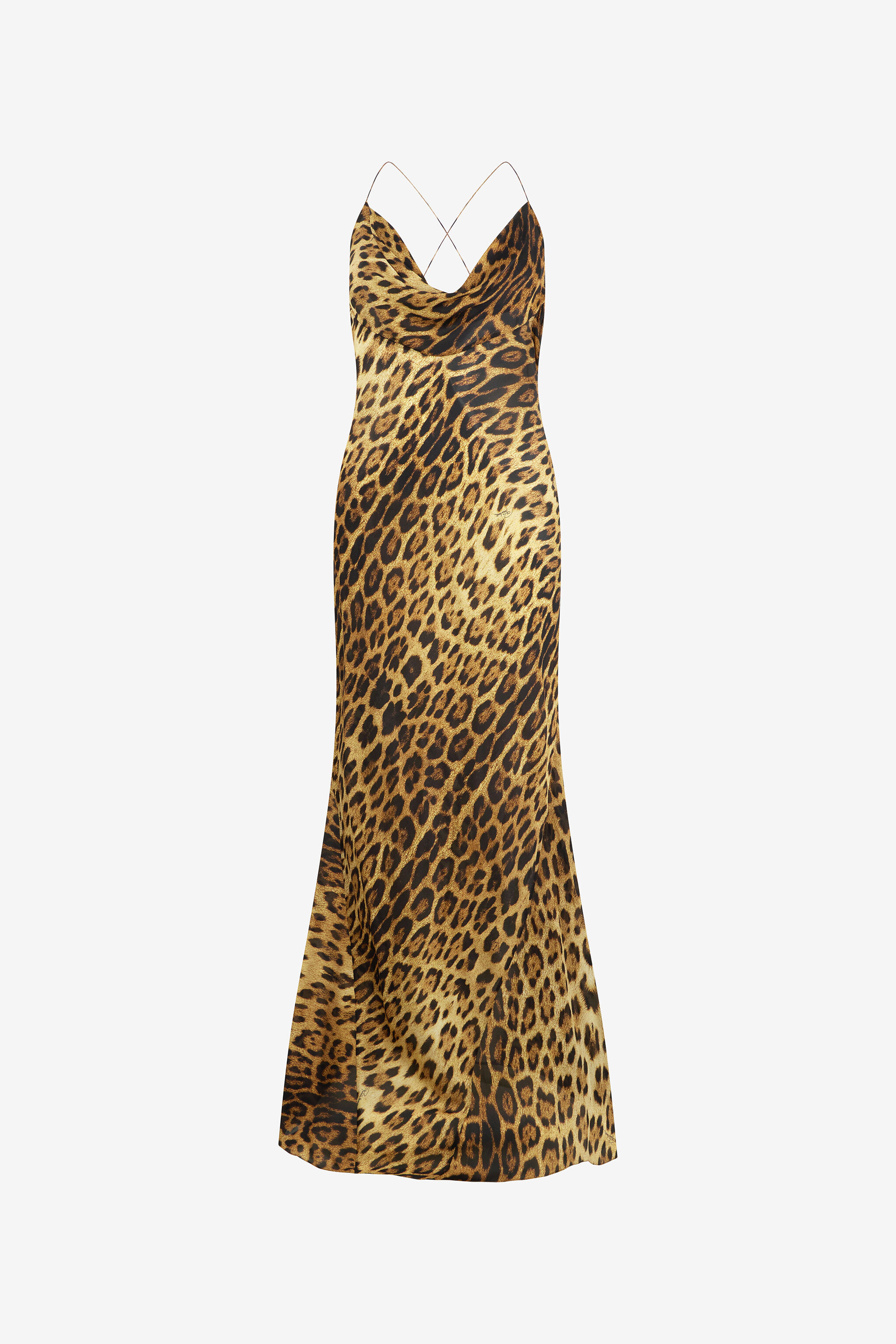 ID: VWT103-HZQ71-00504 This extra-long sleeveless dress by Roberto Cavalli, made of pure silk decorated with an all-over Jaguar Skin print, perfectly embodies the bold elegance that defines the Maison. The model also features a deep draped neckline and thin crossover straps at the back. Details - Extra-long pure silk dress - All-over Jaguar Skin print - Draped neck - Slim crossover straps at the back - Backless