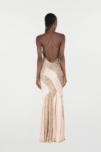 ID: VQT127-FC005-D0631 In this long dress by Roberto Cavalli, romantic elegance meets the wild spirit of the animal universe, which has always been a source of inspiration for the Maison. This silk blend model is distinguished by the soft tones of the captivating leopard print motif with a velvety touch, finished with sparkling golden embroidery. The garment is completed by thin straps that cross at the back and a refined silk band that climbs from the hem and wraps around the hips. Details - Silk-blend slip dress - Fitted design at the waist and loose at the hem - Slim crossover straps at the back - Cascading neckline - Velvet-effect leopard print pattern - Pleated skirt with silk insert