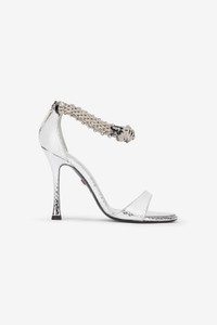 ID: UKS030-PZ579-00106 Synonymous with glamorous and sensual femininity, these bejeweled sandals are made of fine metallic snake scale-effect leather and are decorated at the ankle with jeweled chains and crystal-studded tiger heads. The super-high spool heel slims the figure and gives the style even more punch. Details - Spool heel sandals - Straps with jeweled chains and tiger heads - Made of metallic leather with snake-scale effect - Zip closure on back - Monogram Mirror Snake on the back - Roberto Cavalli signature on the inner sole Care & maintenance Lining:100% Capra hircus linneaus / Outer sole:100% Bos Taurus / Upper:100% Bos Taurus