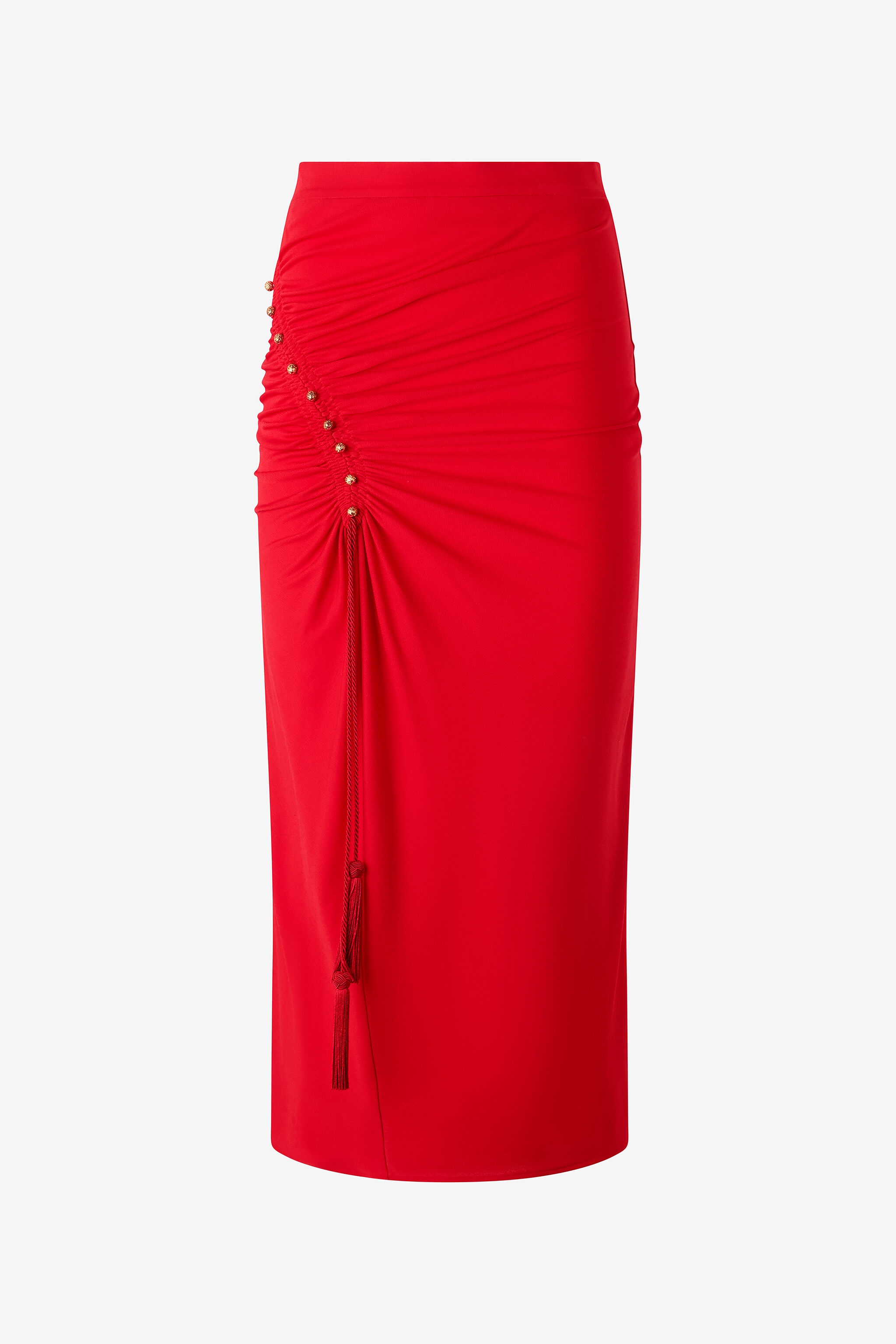 ID: VQT307-JE034-02066 An expression of a refined yet never ordinary style, this midi skirt by Roberto Cavalli is animated by a ruched detail on one side embellished by a shiny diagonal row of golden buttons. The subtle sensuality of the close-fitting cut is brought to the fore by the vibrant shade and soft draping created by a drawstring finished with matching tassels. Adding a further touch of sophistication to the garment is the concealed back zipper fastening and a comfortable high waist that highlights the silhouette. Details - Cowl midi skirt - Ruched detail on one side - Decorative bejeweled buttons - Comfortable high waist - Front fastening with concealed zipper