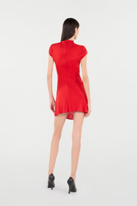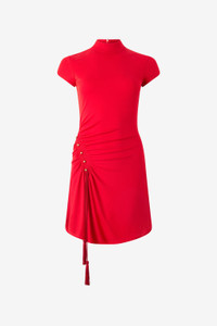 ID: VQT143-JE034-02066 An expression of a refined yet never ordinary style, this mini dress by Roberto Cavalli is brought to life by a ruffled waist detail, enhanced with a radiant row of golden buttons. The subtle sensuality of the fitted cut is brought to the fore by the soft draping created by a drawstring with matching tassel-finished ends. Adding a further touch of sophistication to the garment is the concealed zipper fastening at the back and a classic stand-up collar. Details - Mini dress with gold appliques - Ruched detail that defines the silhouette - Tight fit that loosens at the hem - Diagonal row of decorative buttons - Stand-up collar - Front fastening with concealed zipper